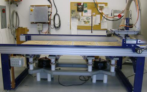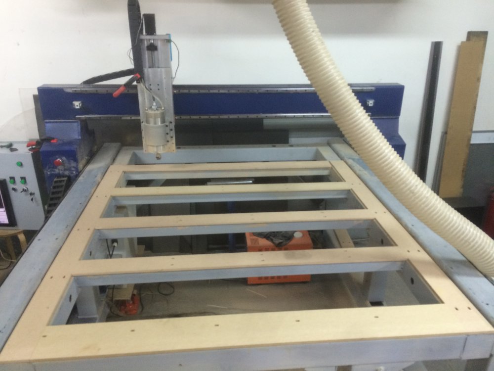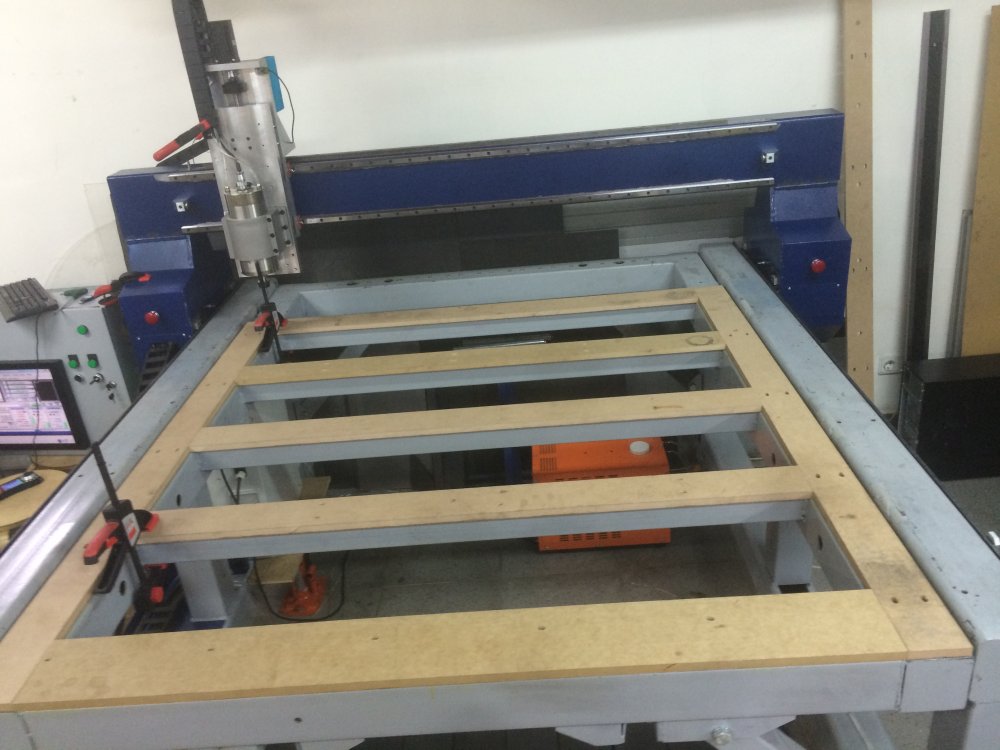 Чтобы стол закрыл металлический каркас, его пришлось сделать больше, чем поле обработки. Ровнял с помощью дополнительного шпинделя.
