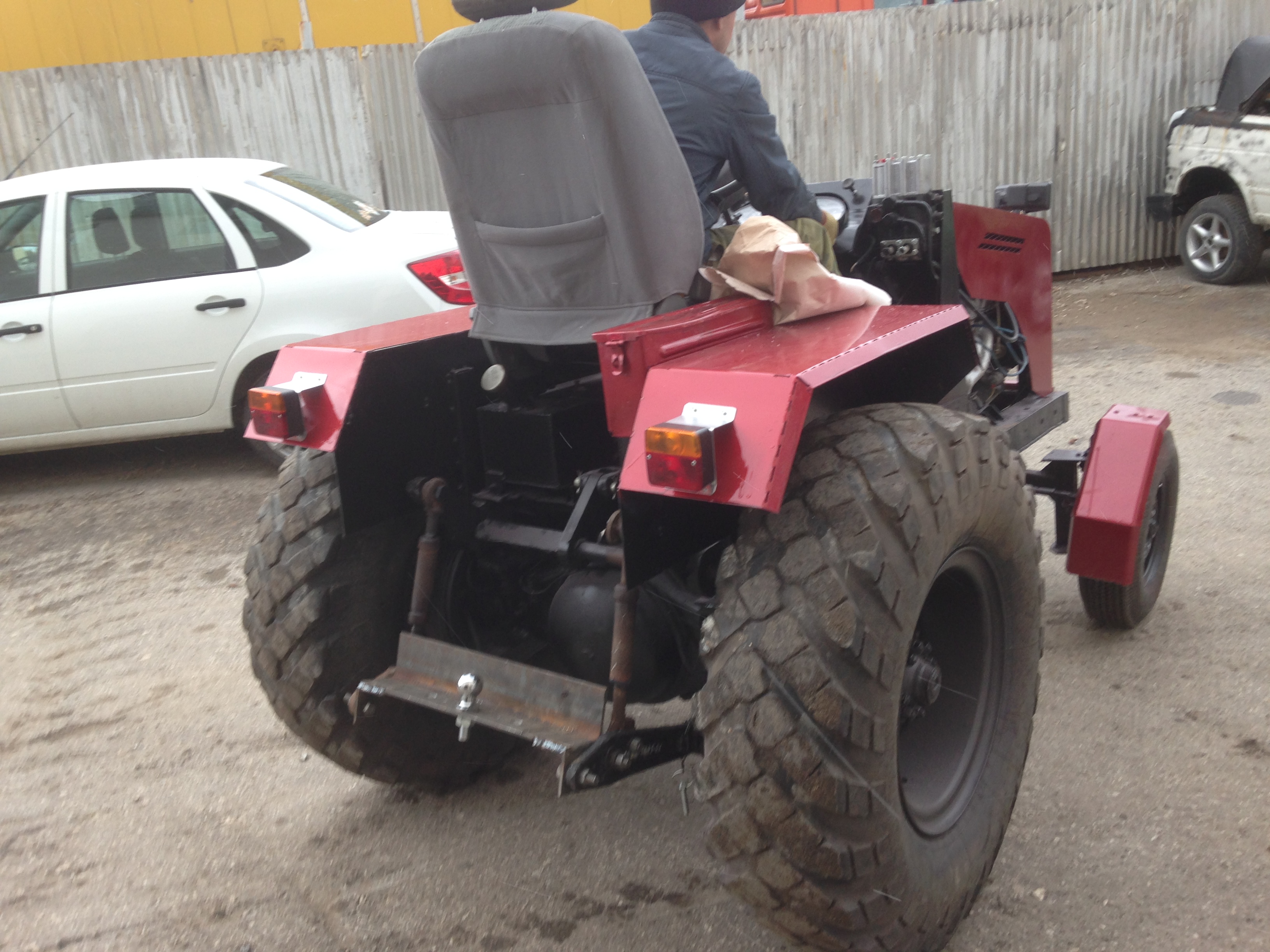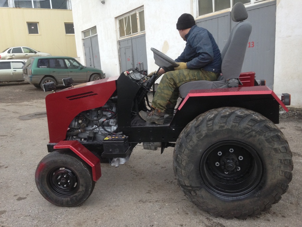 Мини трактор не в тему, но думаю интересна кому будет посмотреть на самоделку, в прошлом году немного свободного времени появилось и решили быстренько сваять для своих нужд. В тракторе установлен двигатель м 412, Кпп родной москвич+ для Газ 66 с редуктором на вал отбора мощности, мост задний газ 66 укороченный с блокировкой. Тормоза и сцепление Москвич, мост передний самодельный, рулевое управление; рейка от калины, гидравлика сборная, насос НШ 14, цилиндр от Беларусь, навеска самодел, также рама, бензобак, маслобак, крылья, (СТОЙКА ЧПУ) :freak: тфю, стойка приборов управления самодел! сиденье от иномарки с подогревом и регулировками, Подогрев ах, зимой аш ноги от него греются :D , руль достался от какого то форда с переключалками на руле и подушкой :hehehe: панель приборов волга. на спидометре 200 :D , показывает все, уровень бензина, давление, заряд и.т.д.