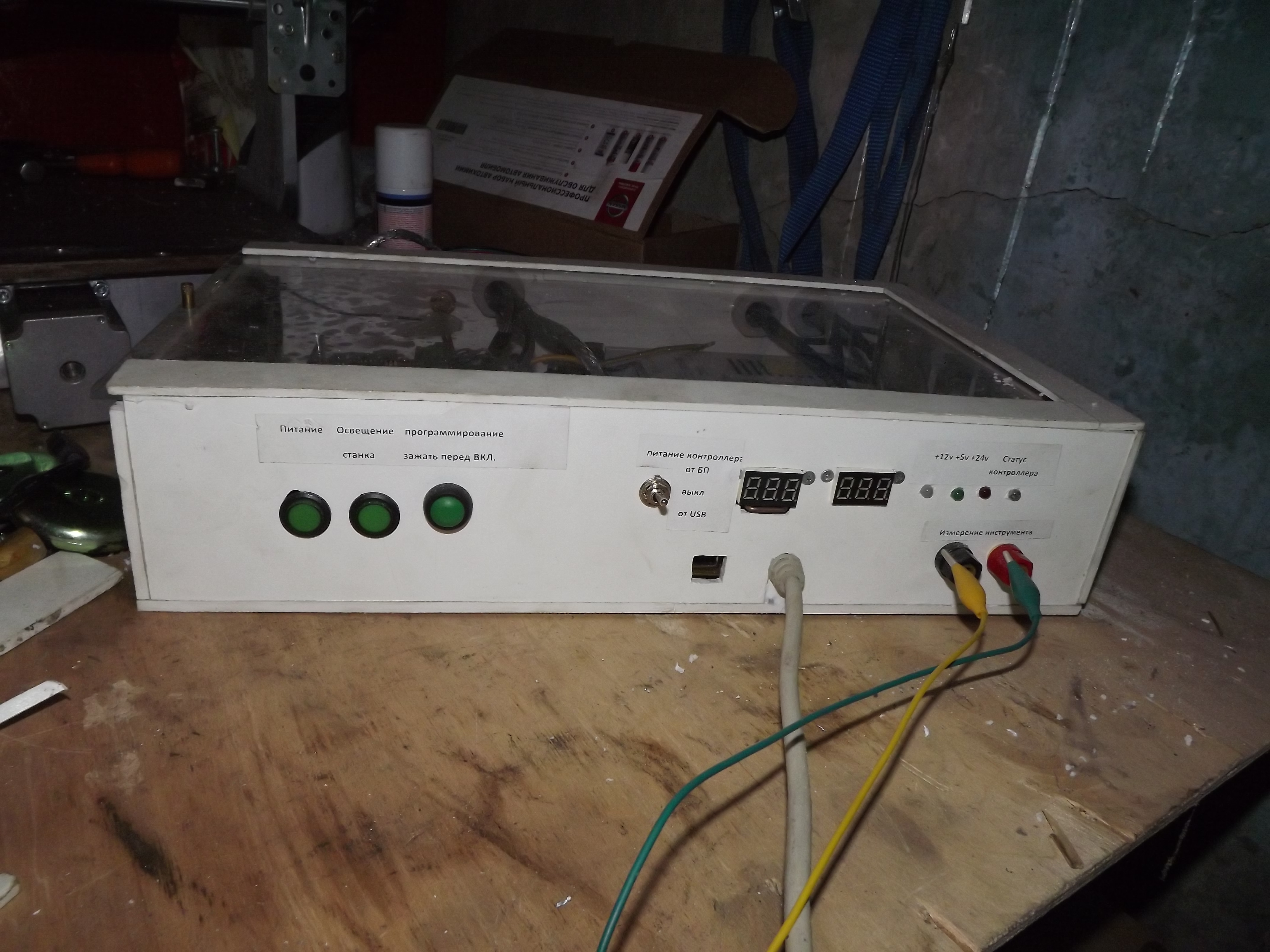 В текущем варианте установлено обычное реле для запуска шпинделя, при старте которого иногда контроллер подвисает - решение заменить на твёрдотельное (куплено ждёт тепла :hehehe: )