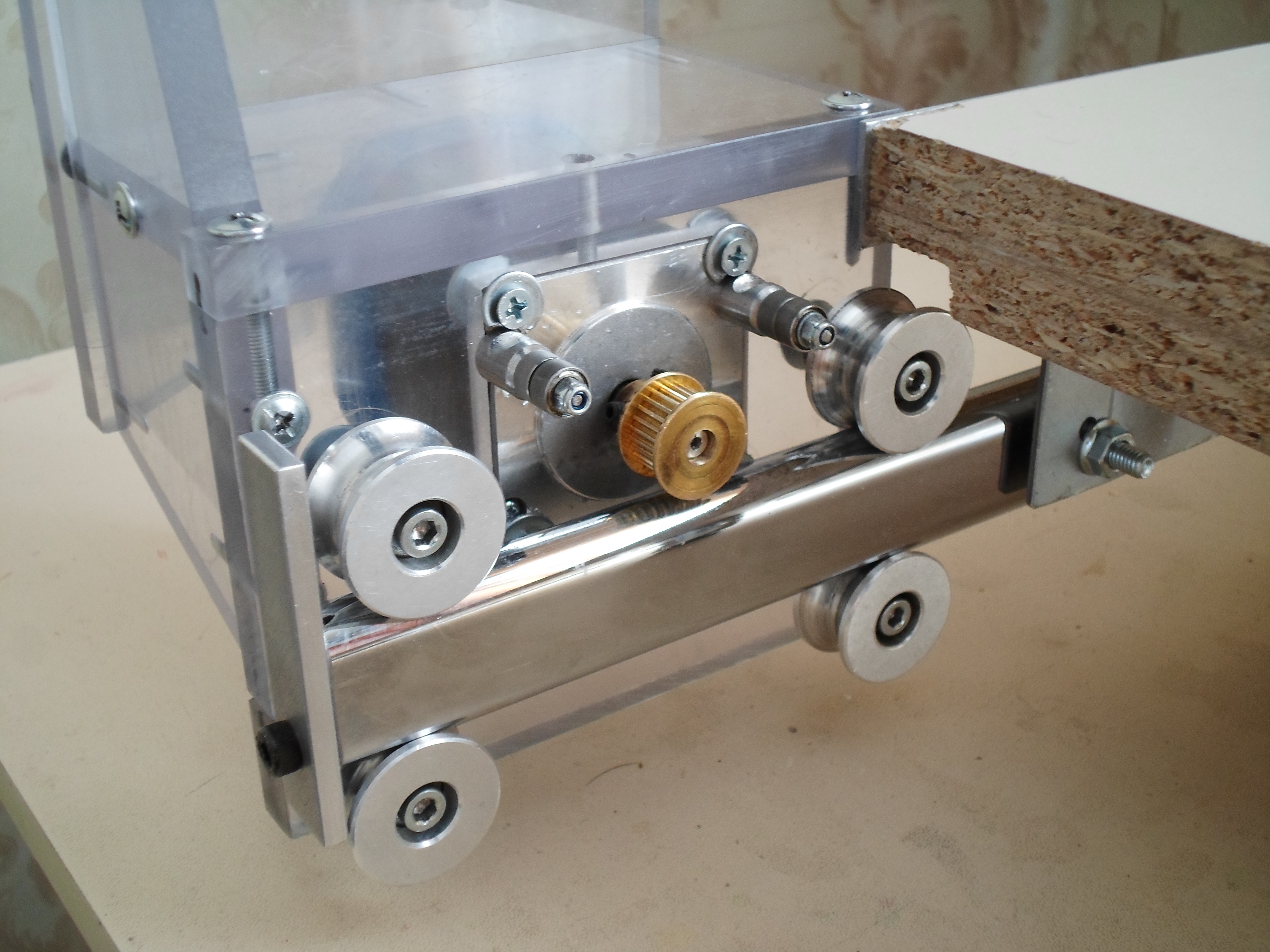 Тогда придётся оси роликов опускать ниже, потому как при увеличении диаметра они будут задевать нижнюю плоскость стола. Посмотрю детальнее как там с пространством позже, все железяки дома, а я на работе.