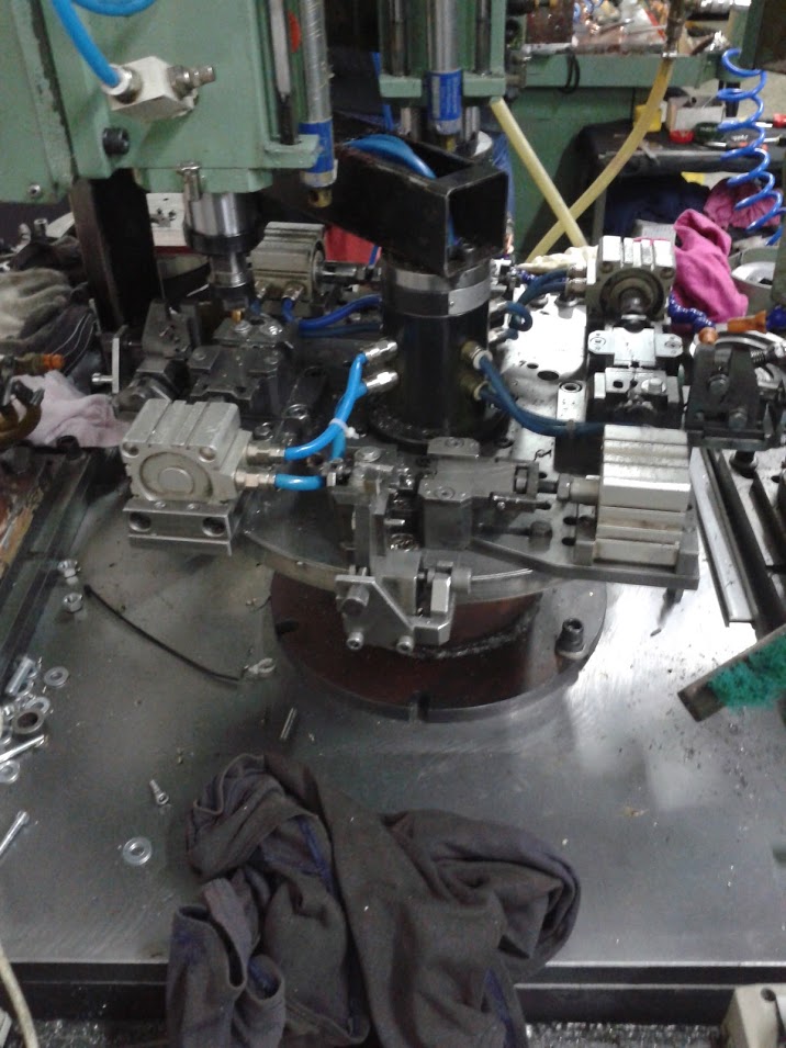 на поворотном столе через каждые 90 градусов стоят приспособления с пневмозажимами и выполняются операции - центровка , сверление и нарезание резьбы.