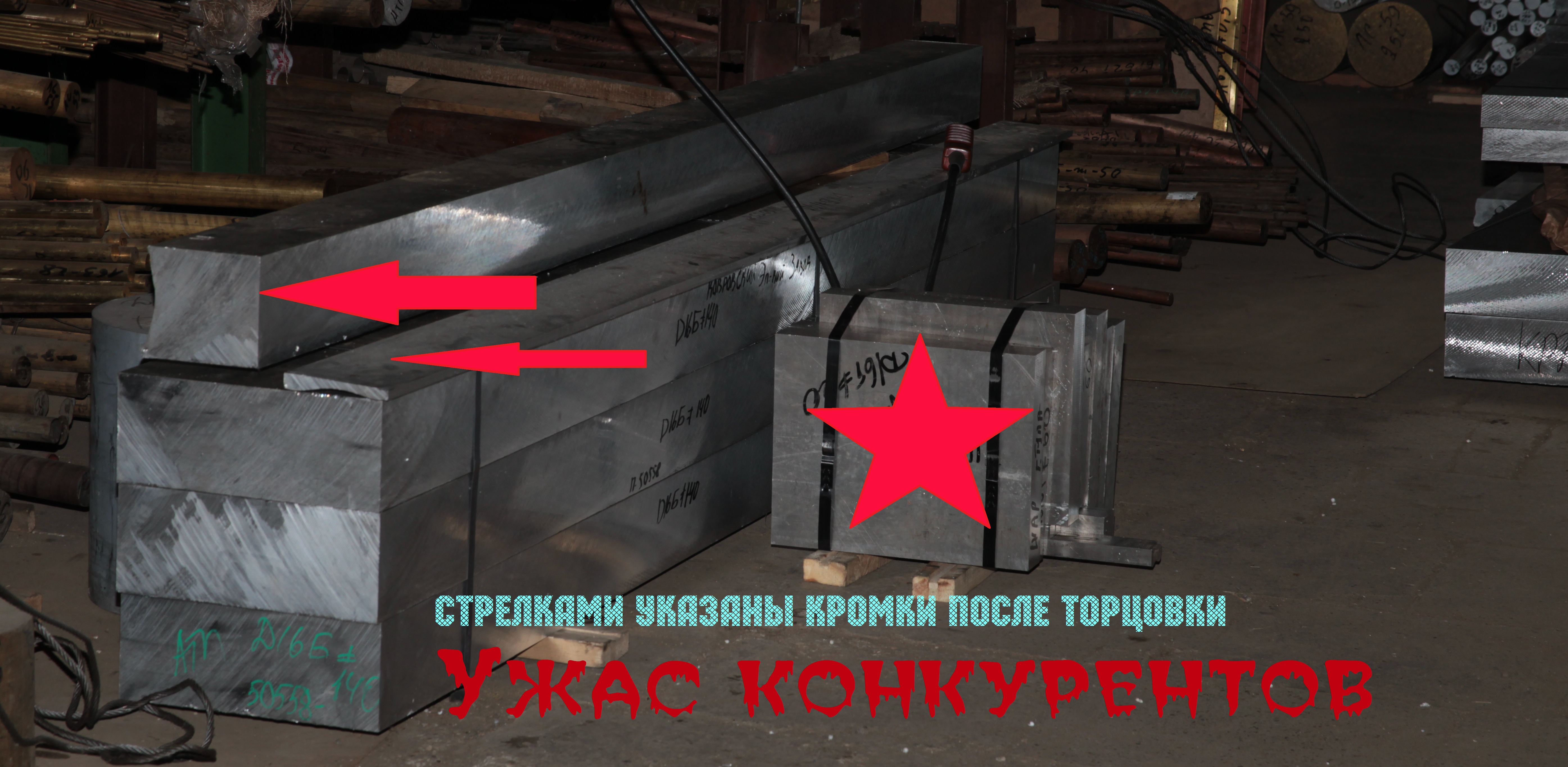 Плита Д16Б ≠140мм. Нарезка вдоль. L~3100mm позволяет минимизировать отходы. Сбоку-справа порезанная плита Д16Т ≠60мм на заготовки. (Звездой закрыто название заказчика, который раньше брал заготовки из Д16Т у конкурентов, которые резали на гидроабразиве. Узнав про наши цены на материал и резку заказчик очень расстроился и обрадовался одновременно) (3372 просмотра) <a class='original' href='./download/file.php?id=79037&mode=view' target=_blank>Загрузить оригинал (2.23 МБ)</a>