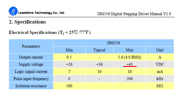 У меня такой же комплект , DM556 и моторы 57HS22-A 4.0 A . , подключено параллельно , питание 36в.