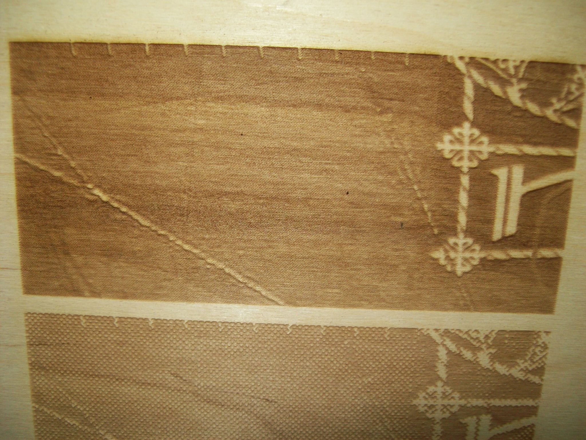 Визуально немного больше понравилось загружать в градациях серого и растрировать в LaseCAD с точкой 0,4мм и гравировать 0,1мм за проход...