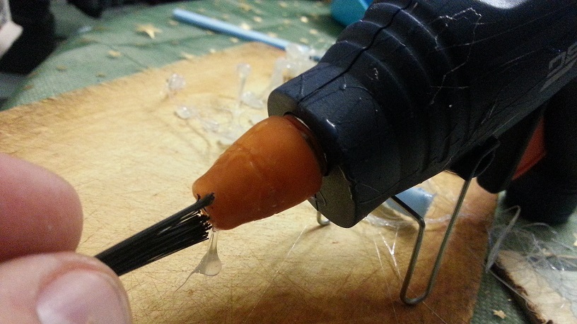 Клеить можно чем угодно, но для ускорения процесса я использовал простой клеевой пистолет помощнее. Очень важно, чтобы все волоски щетины были пропитаны клеем. Поэтому тщательно с торца загонял расплавленный клей внутрь каждой пряди.