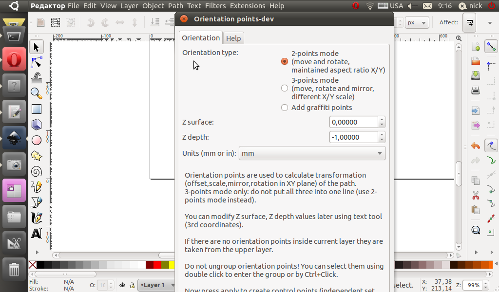 Сразу создадим точки ориентации. Они определяют положение оси вращения токарного станка - она будет на уровне горизонтальной оси. Для создания точек ориентации заходим в Расширения - Gcodetools - Orientation points и жмем Применить.