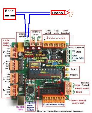 К выходам "Inverter Control" китайцы думали подключать внешний частотник мощного шпинделя, для регулировки оборотов. Я свой шпиндель подключаю через реле выхода на плате "Output switch 3". 48вольт на шпиндель подаю через платку мягкого разгона и регулировки оборотов крутилкой. Ты на свой лазер подавай питание, комутируемое релюшкой 3 выхода (как на схемке).