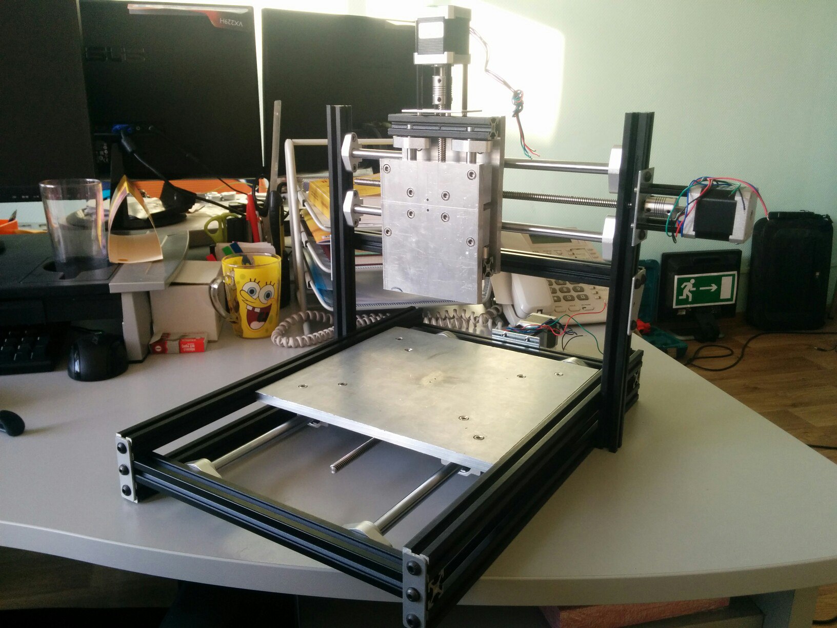 Собирал из куска 12мм алюминиевой плиты Д16Т, двух простаков и двух кусков профиля 20х20. Проставки понадобились для того, чтобы при движении каретки оси Z не тёрлись об плиту.