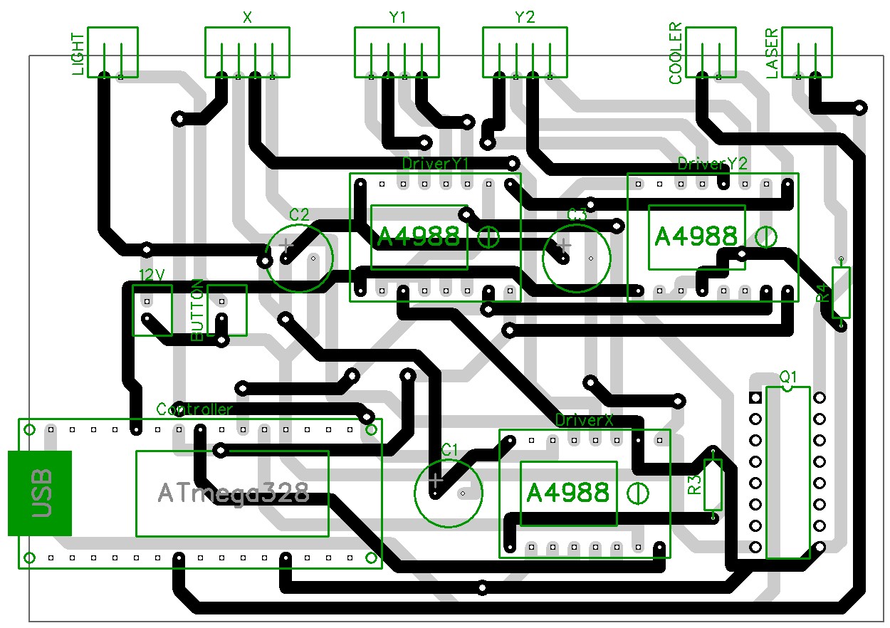Так же, как я понял, MS1/MS2/MS3 отвечают за режим работы шаговиков. На оригинальной плате (см. фото из первого поста темы) они все замкнуты на 5V, сделаю также. Если обратить внимание на это фото можно увидеть там микросхему ULN2001D, но при этом он спокойно печатает оттенки серого через китайский софт. Не знаю как это воспроизвести в GRBL. За неимением LT1121 буду делать на ULN2003, которая у меня есть. Еще на выходе выходе лазера на исходной платке стоит резюк 96 Ом, тоже оставлю, возможно запараллелю потенциометром. Почему, кстати, охлаждение в GRBL висит на аналоговом пине, а не на цифровом? Он же просто включен или выключен.