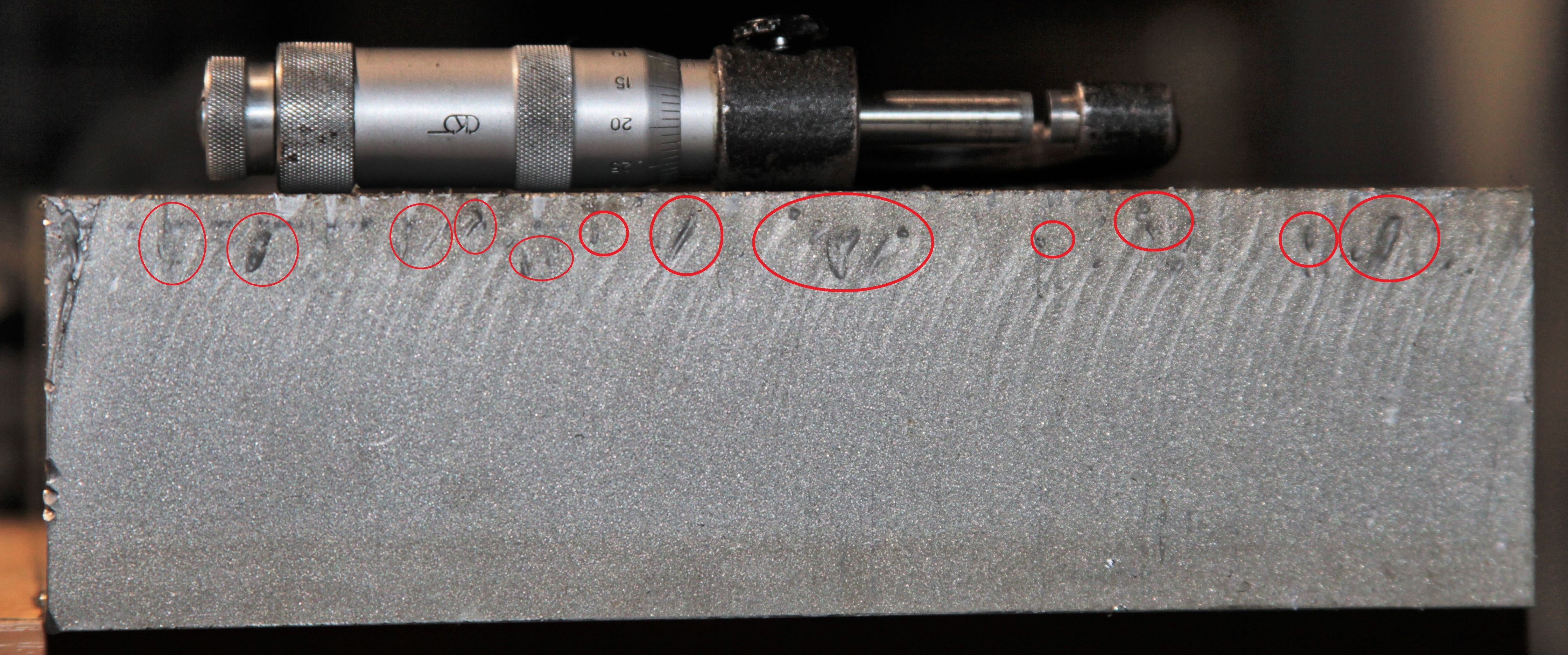 Но меня заинтересовал срез, странный какой-то. Раковины непонятного происхождения с противоположной стороны от сопла гидроабразива. На первой фотке эти дефекты выделил в красных кружках. Причём данный дефект был на противоположных гранях,--плиту резали на гидроабразивке на полосы, а потом на ленточке.