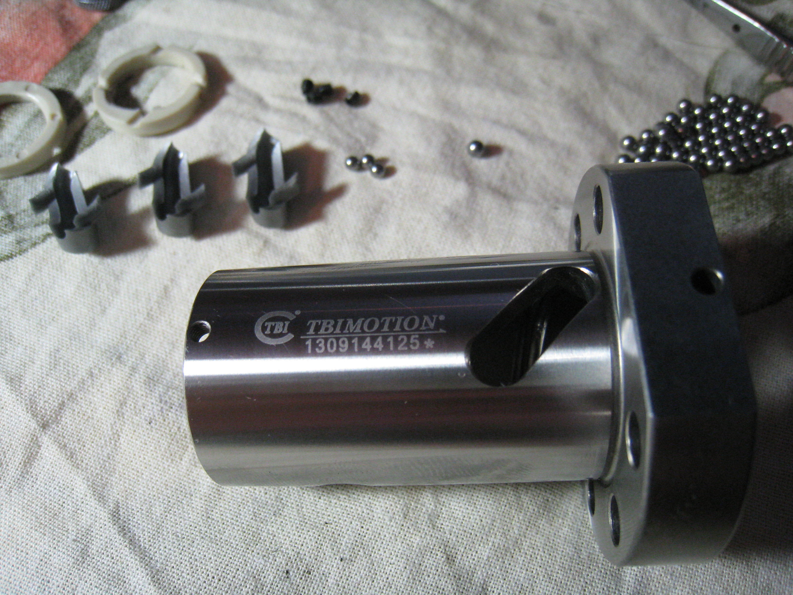Перебираю гайку ШВП, качество изготовления гайки TBI на порядок выше обычных китайских SFU. В гайке не было смазки, было совсем немного древесной пыли. Но хрустела она не поэтому - я прикололся от количества и размера шариков 3.18 мм 1 шт, 2.66 мм 3 шт, 3.26 мм 51 шт :thinking: