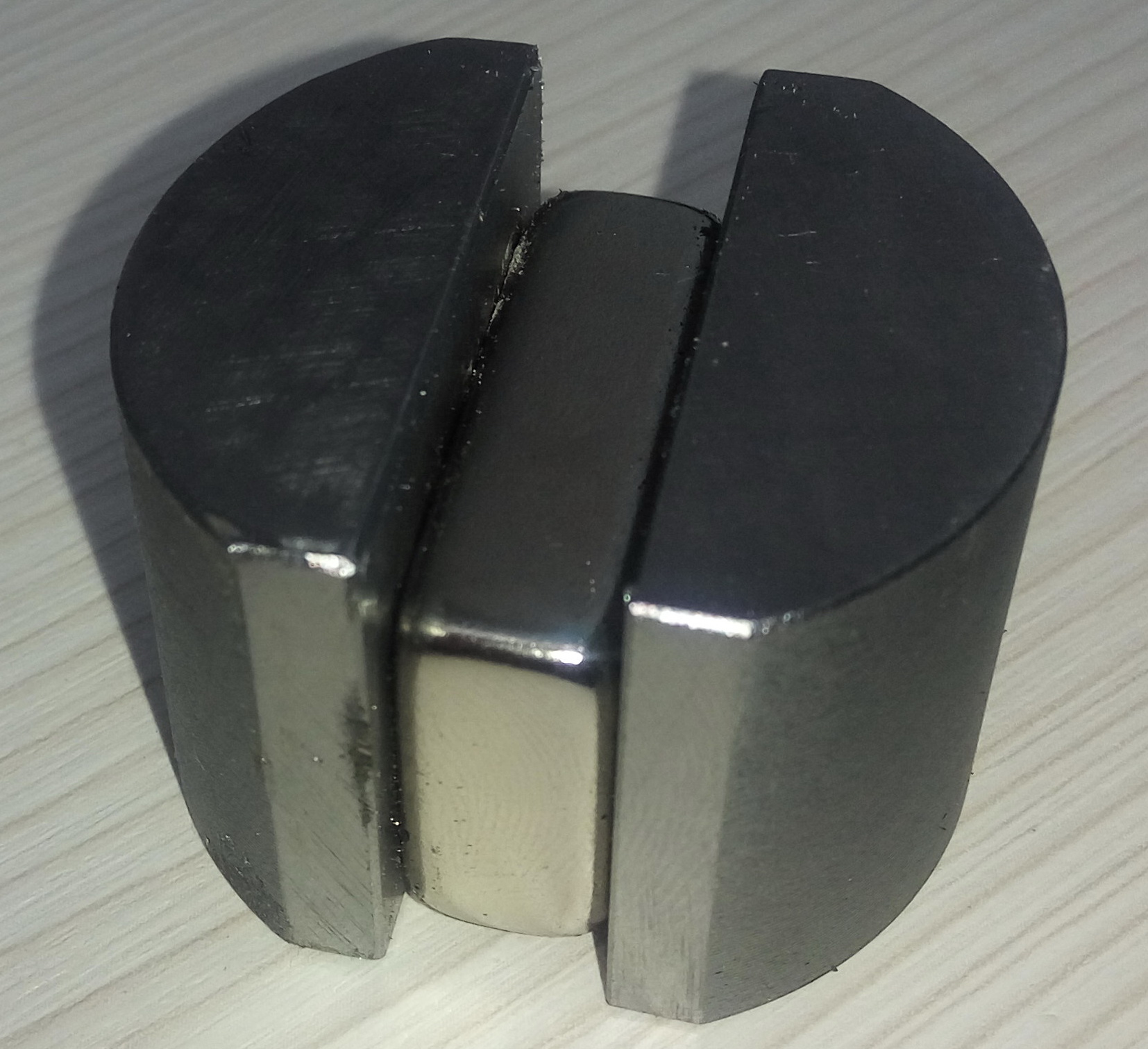 Думал сначала собрать батарею конденсаторов и магнитить родной магнит, потом решил переделать на NeFeB... Заказал подходящий кирпичик на али (10х20х30), сделали полюсные наконечники к нему. Намагничен правильно, когда леплю к чему-нибудь фиг оторвешь, винтики через столешницу 18мм ориентируются поперек полюсов, когда подносишь.