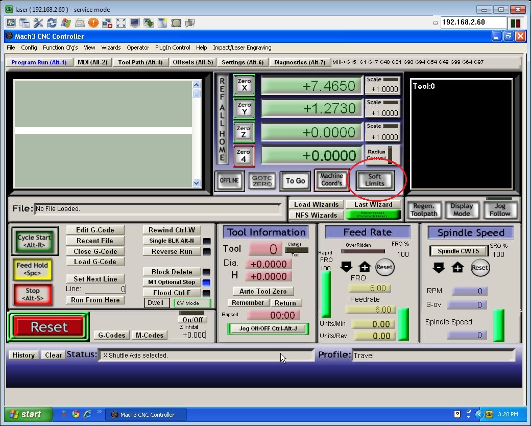 Дрюня писал(а):Не помню сейчас как Mach3 без концевиков и обнуления при старте понимает машинный "0", где включил программу там и ноль?