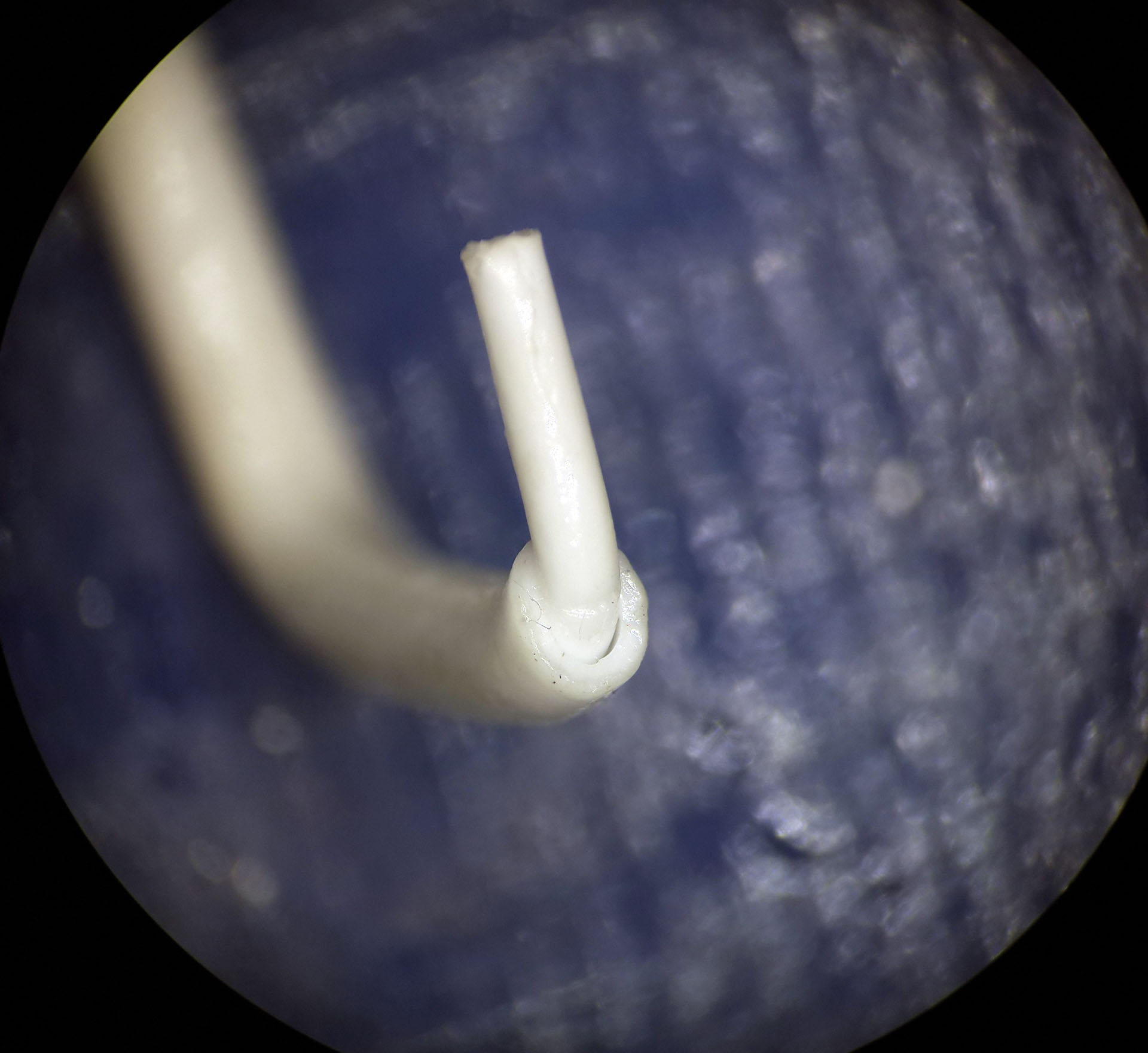 Вот пример отливки в форму из него: Это был нижний литник из одножильного провода в изоляции. Для масштаба: диаметр жилы 1.5 мм. Как видите, пролилось не только повреждение жилы при снятии изоляции (небольшая канавка на сгибе), но и отогнувшаяся изоляция