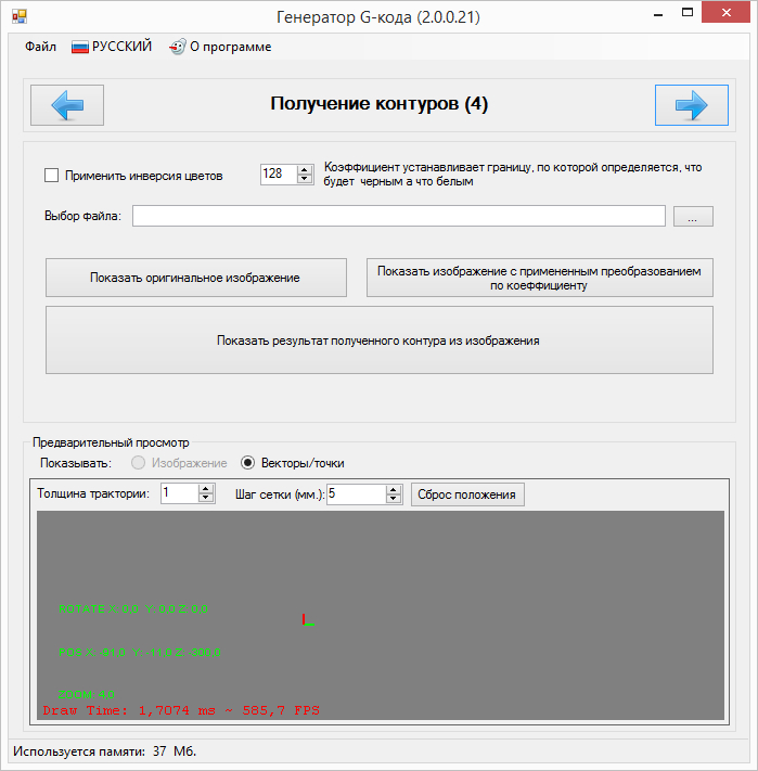 Для получения контуров, рисунок необходимо преобразовать в 2-х цветный рисунок, из цветного, для этого с помощью коэффициента подбирается желаемый результат, после подбора, можно поставив флажок, инвертировать получаемое 2-х цветное изображение. После этого можно запустить получение контура.
