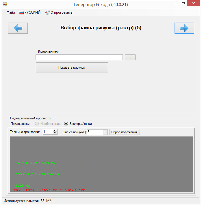 [*]Рисунок, выполняется генерация G-кода для выжигания лазером (jpg, jpeg, gif, bmp, png).