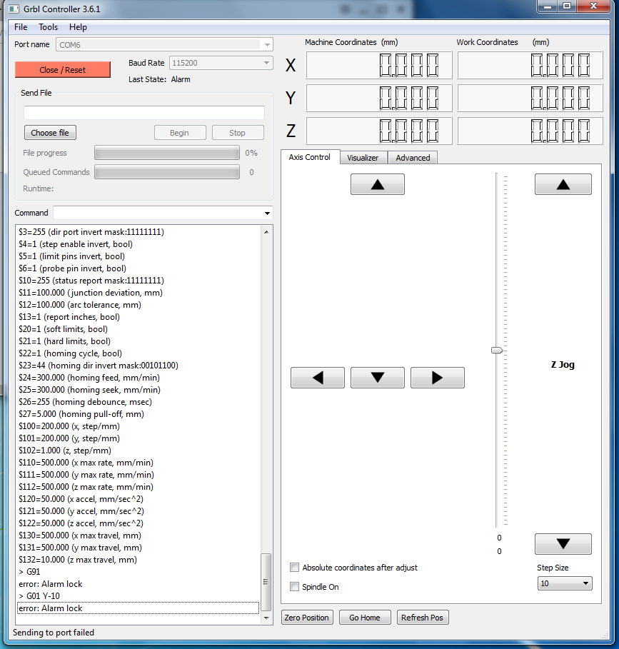 пока что видно из криминального "Last state: Alarm" и какой-то ад в координатах. После кнопы Zero position что-нибудь происходит?