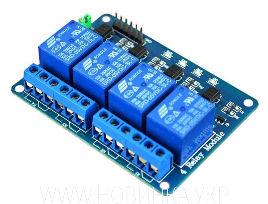 Если посмотришь на фотку, то там в верху есть контакты, которые соединяются с выходами контроллера, и отдельным питанием например 12 вольт, на реле подается 12 вольт, только тогда, когда с микроконтроллера идет сигнал на оптрон, который в свою очередь уже коммутирует реле.