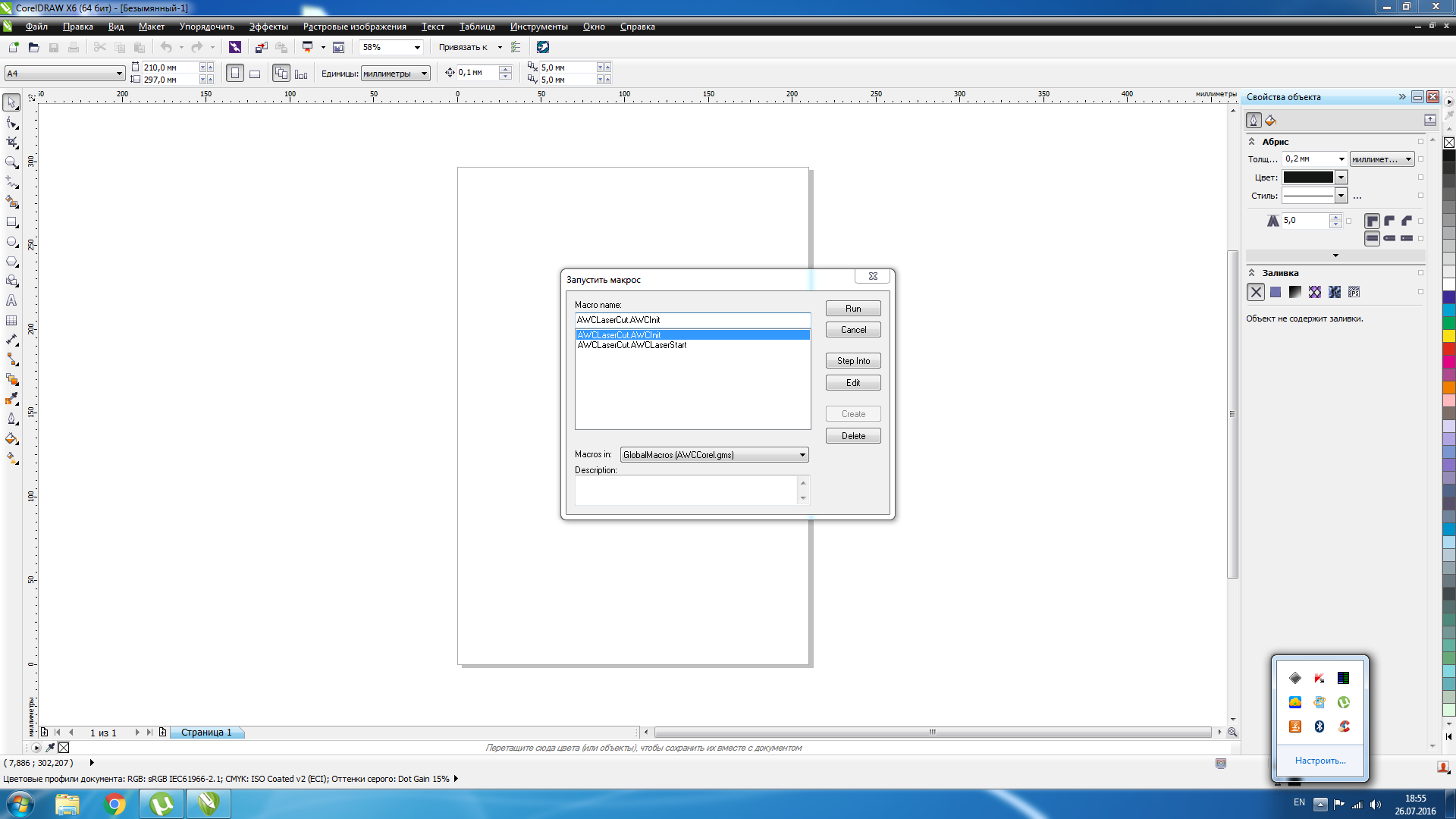 После установки плагина открываем Корел, идём в Инструменты - Макросы - Запустить макрос: Выбираем в нижней выпадашке GlobalMacros (AWCCorel.gms). После этого в верхней части окна макросов появляется два макроса: