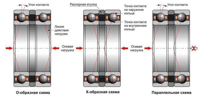 На картинках двухрядные подшипники, ну или спаренные. Схема будет другая. На конце сдвоенный упорно-радиальный, а со стороны двигателя - простой радиальный, для поддержки.