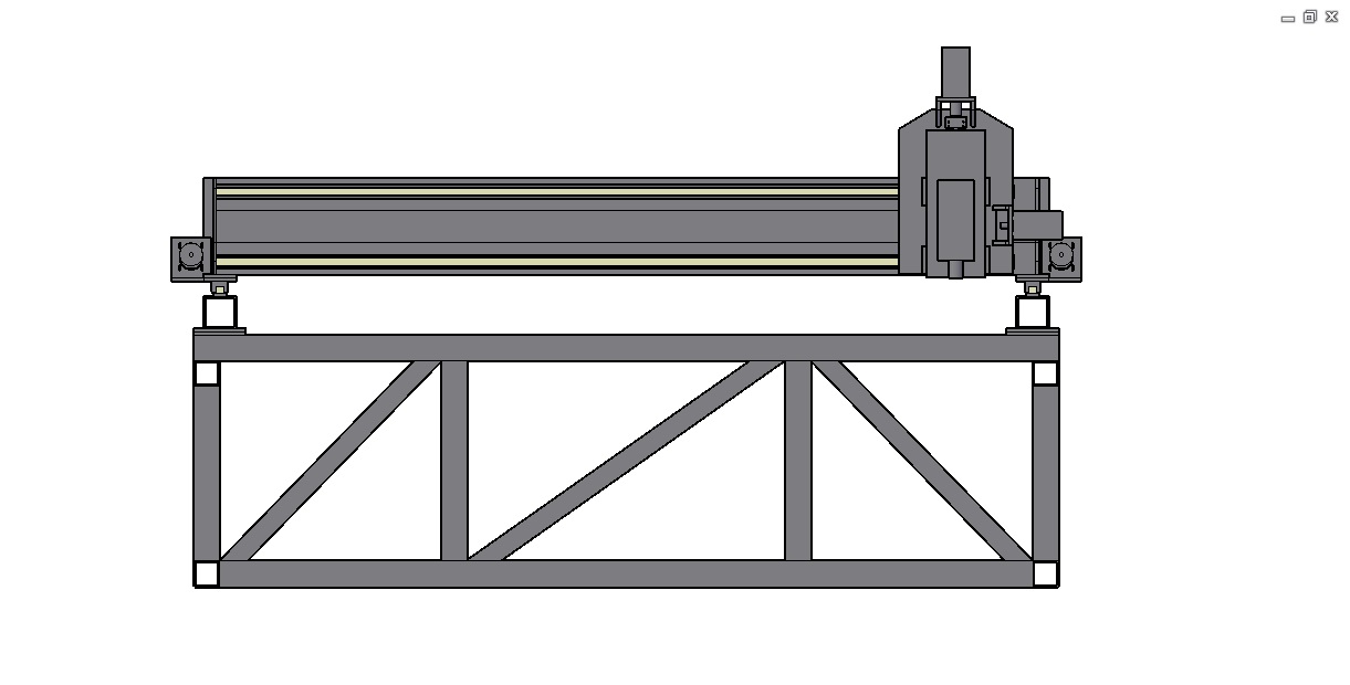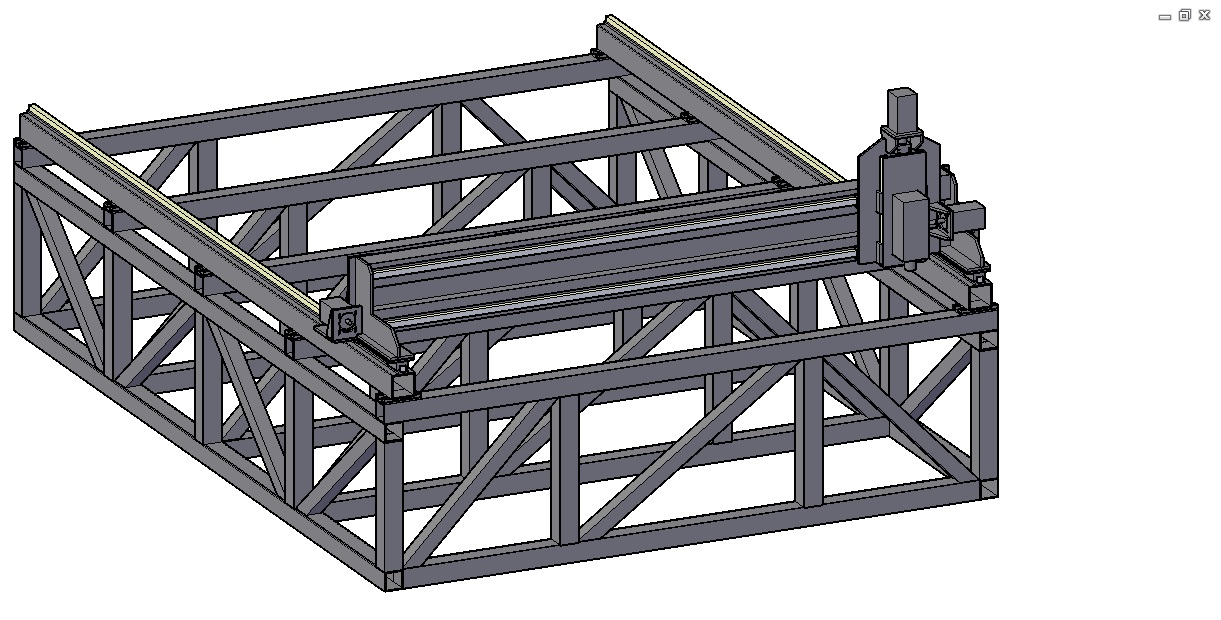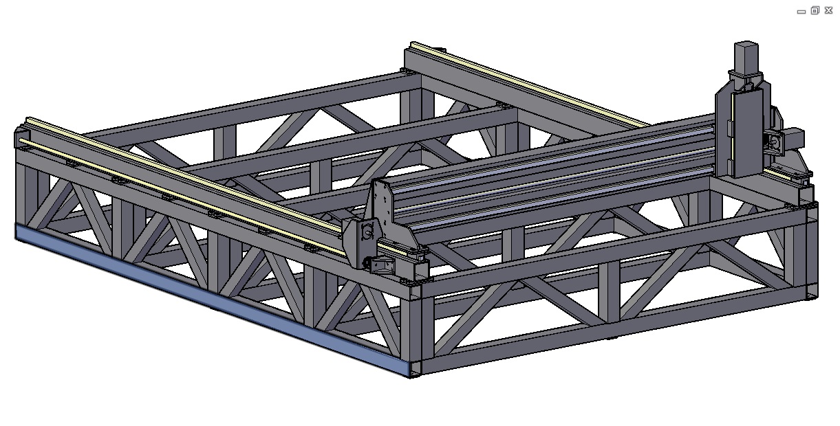Прошу раскритиковать станину, пока она не отправилась в сборку, ибо портальник собирать буду первый раз. Первый проект был проходного типа - там проще, размеры не те. Рама планируется сварная, блоками из профильной трубы 80х80х3 и 60х60х3 - косынки. Отдельно будут сварены боковины рамы на прихватки, отдельно поперечные фермы. Направляющие по оси Y лежат на стальной пластине 10мм, приваренной к трубе 100х100х4. На трубе приварены установочные пластины из 10мм листа, которыми они будут крепиться к раме на болты. Портал сварной из двух труб 100х100 и 100х50 между ними, направляющие по Х также на полосе 10мм. Все плиты будут резаться на лазере из ст3 10 мм.