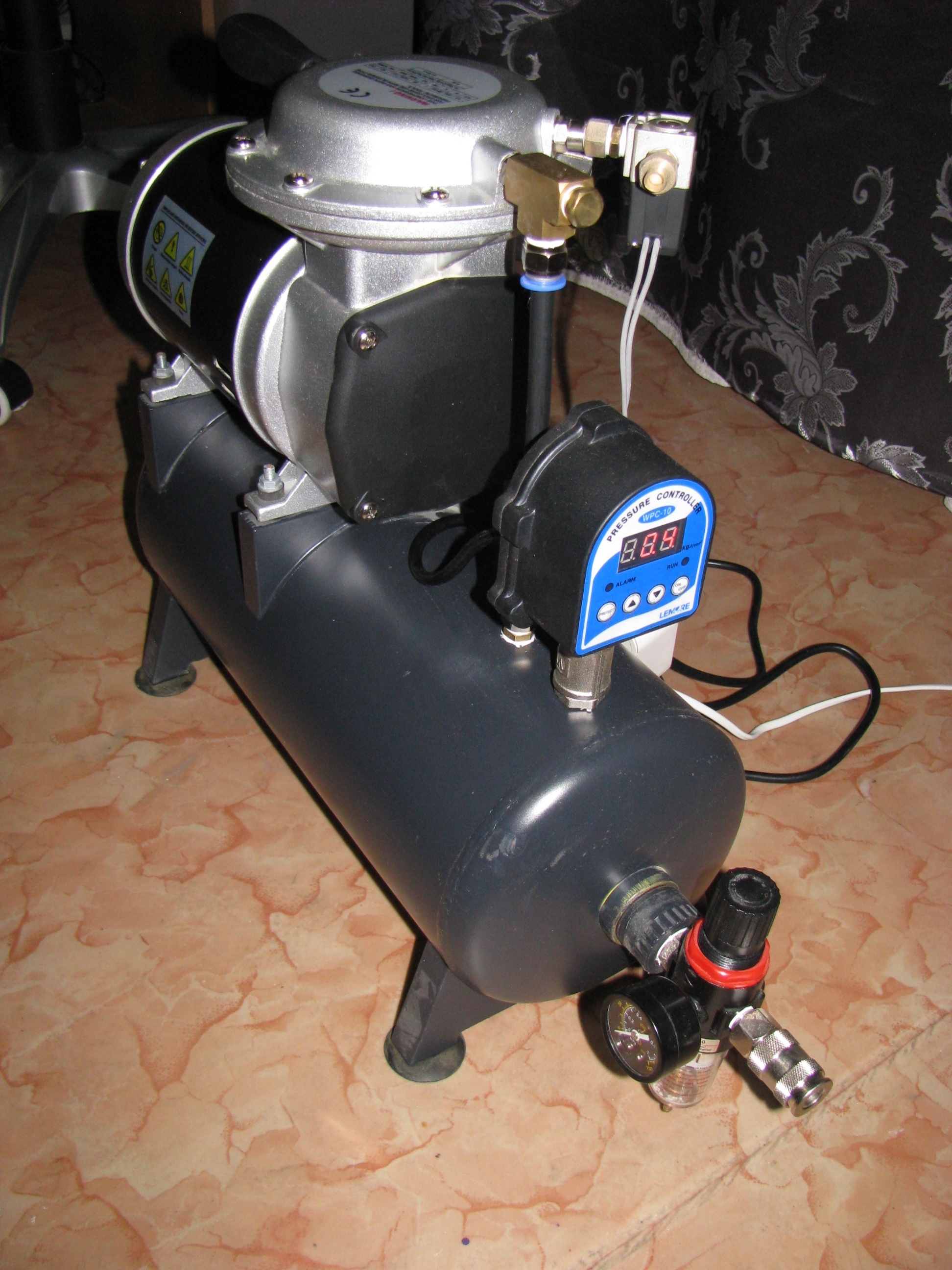 Делал себе похожий агрегат для аэрографа. Компрессор мембранный 3.5 атм. 150 л/мин. Ресивер - баллон огнетушителя (10 л). Реле давления электронное из Китая, повезло - купил по акции за 20$. Настройка включения/выключения от 0.1 до 10 атм. с дифференциалом от 0.1 атм. Выпускной клапан электромагнитный, тоже Китай. Обратный клапан на ресивере - Китай.