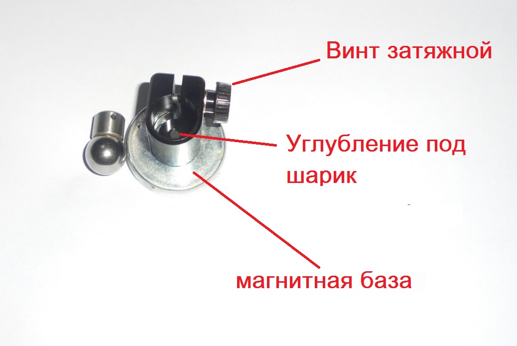 Устройство базы. База устанавливается на стол станка и имеет для этого магнит в нижней части. Корпус базы сделан так что в ней при расжатом винте свободно вращается шарик. Когда найден центр оси вращения (кто видел видео поймет), винт затягивается и шарик никуды не двигается. Сам измерительный датчик имеет с двух сторон резьбу, с правой стороны мелкую (как на индикаторах часового типа) и крупную резьбу слево. Справа вкручивается шарик, слева можно вкрутить как шарик, так и магнит. Вся система в сборе Чтобы сочленение вращалось и изгибалось используется система шарик + магнит. Но шарик не касается магнита, а упирается на 3 медных выступа в кольце. Все приспособления можно изготовить самому.