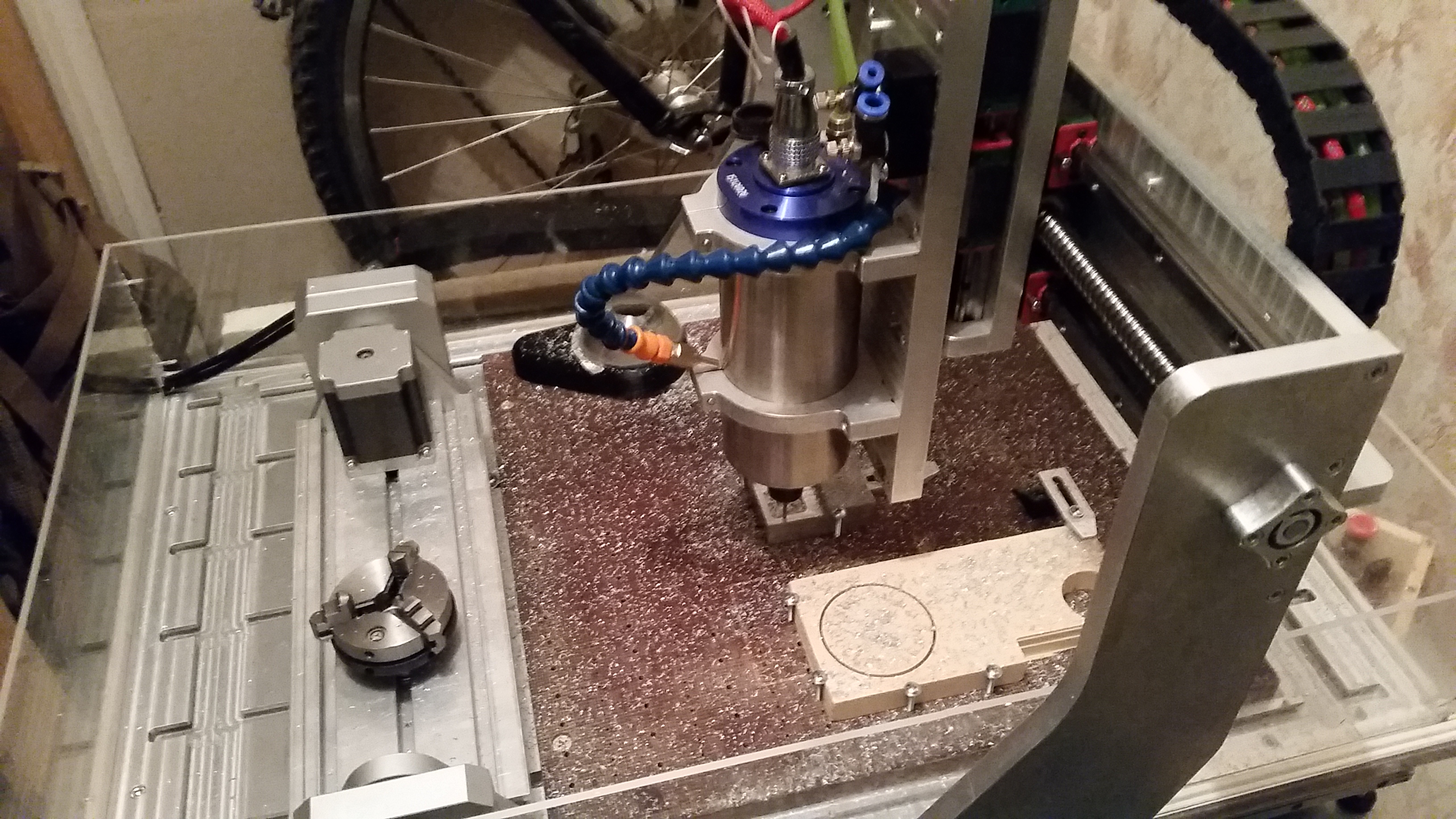 Несколько фоток и видео того что получилось: P.S. Сначала я сделал жертвенный стол из текстолита, а когда почувствовал что уже не так часто врезаюсь в текстолит - убрал его и фрезернул крепежные отверстия в столе.