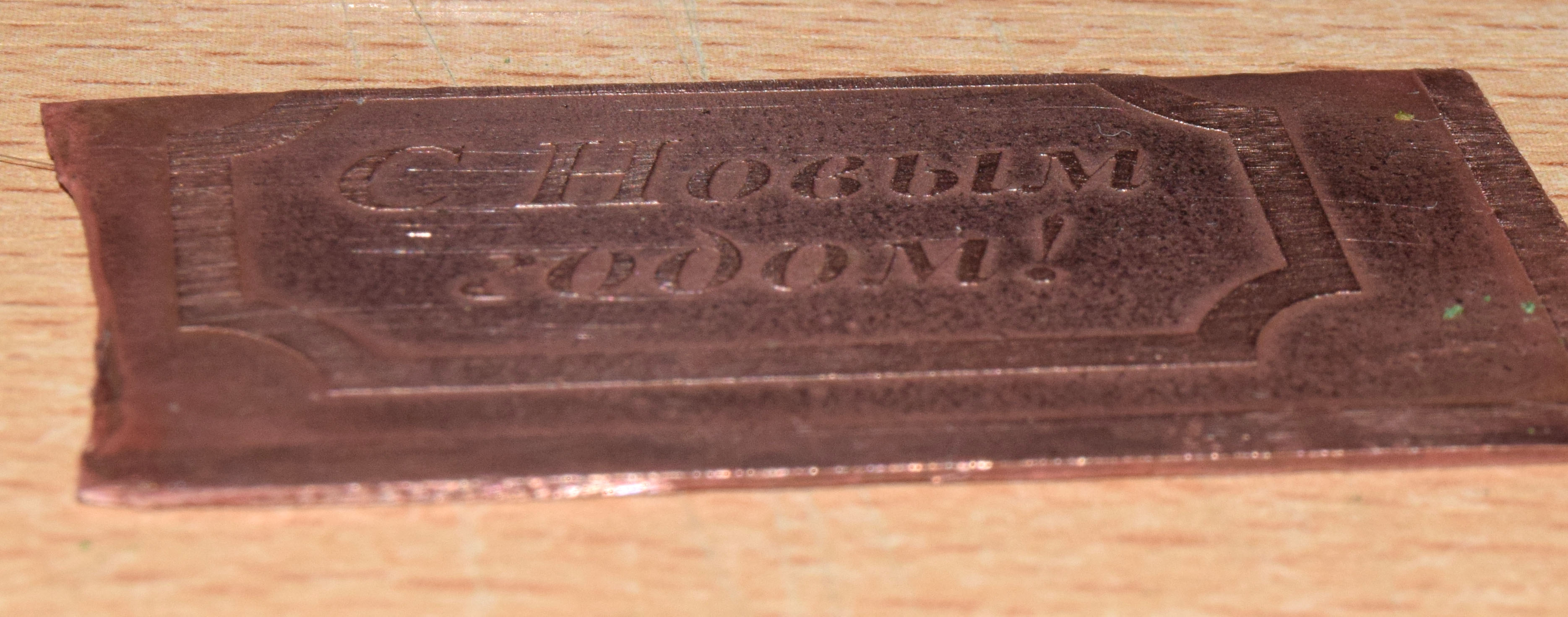 Берём медную пластинку, шлифуем, обезжириваем, наносим краску, гравируем на станке рисунок, травим, немного протираем тряпкой с зубной пастой (в идеале надо бы обработать дремелем с войлочным кругом, но у меня сейчас нет такой "роскоши" под рукой)