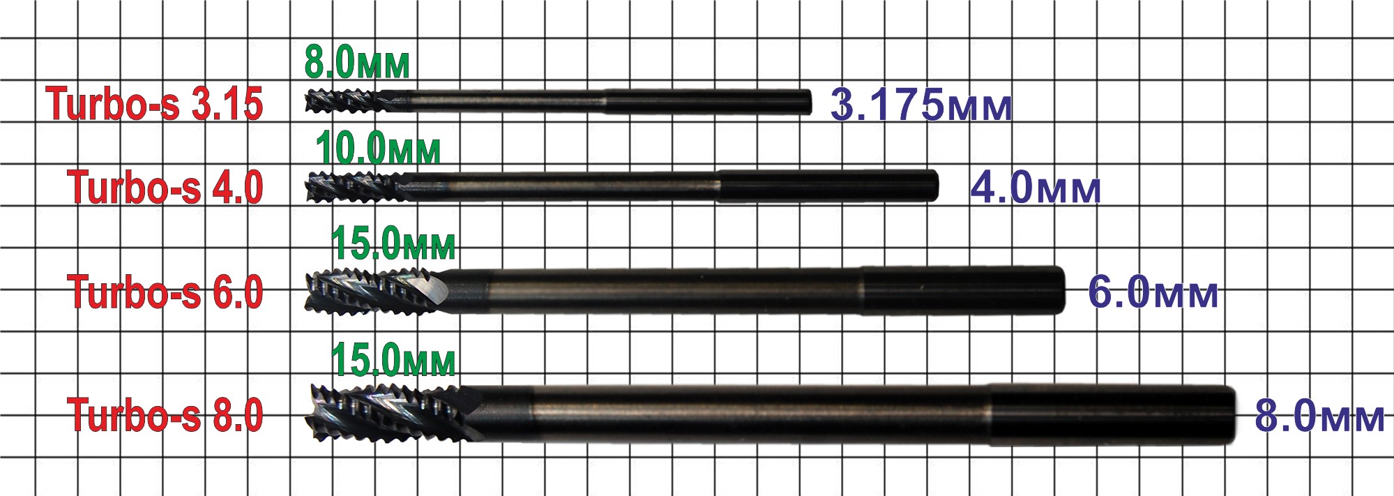 - Turbo-s 8.0 - Ø 8.0мм, 4ножа=15мм +сужение L=70мм, хвост. 8.0мм 3200₽
