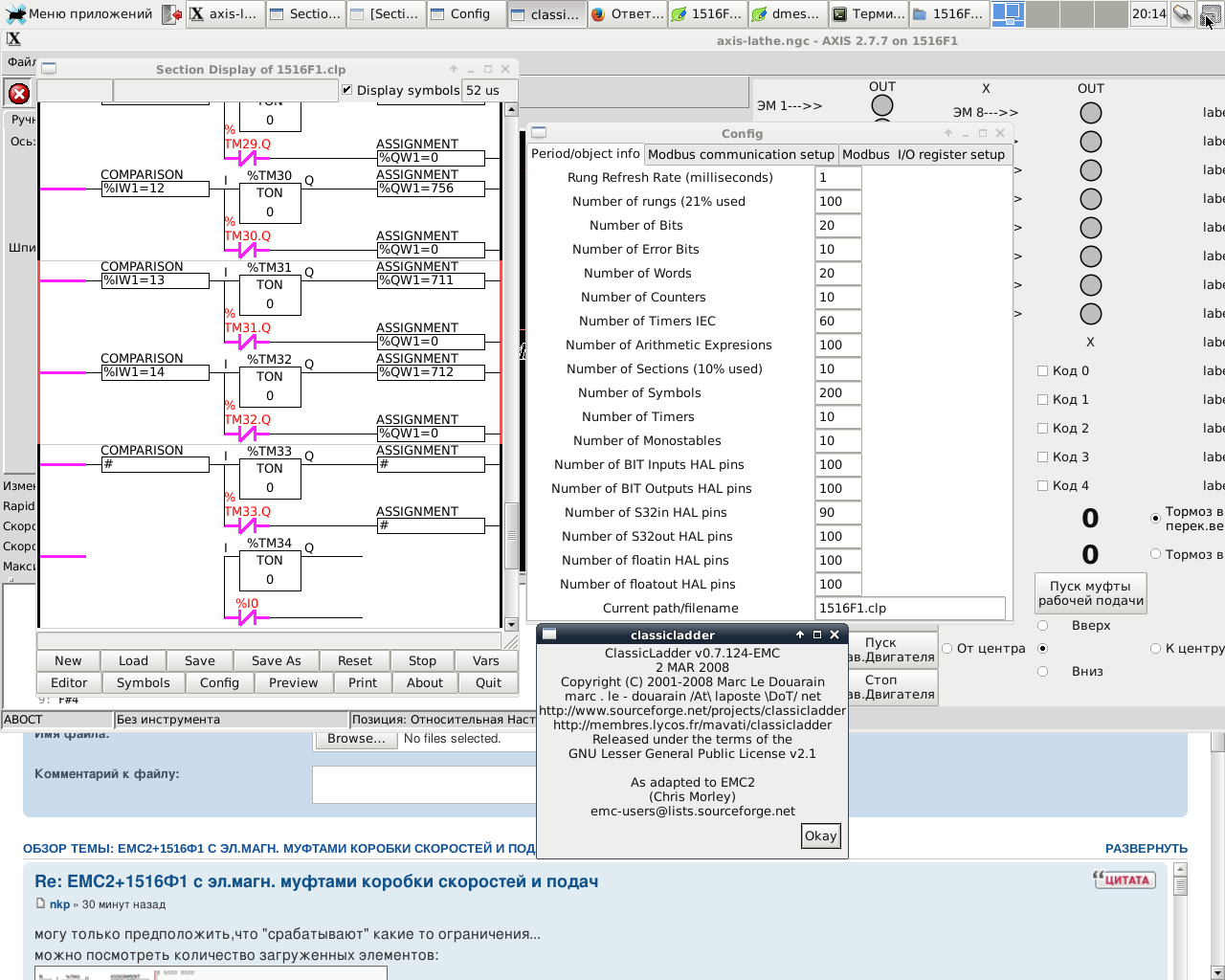 loadrt classicladder_rt numPhysInputs=120 numPhysOutputs=120 numTimersIec=80 numS32in=120 numS32out=120 numFloatIn=120 numFloatOut=120 numSymbols=1000 numArithmExpr=500 numWords=120чуть уваличил в ини число элементов