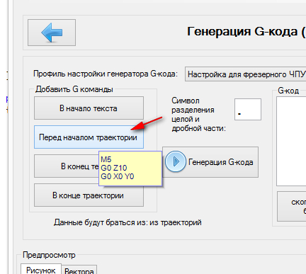 К сожалению, а может и к лучшему, но содержимое кнопок "перед началом траектории" и "в конце траектории" по-прежнему игнорируется при генерации кода! Может просто убрать эти кнопки?