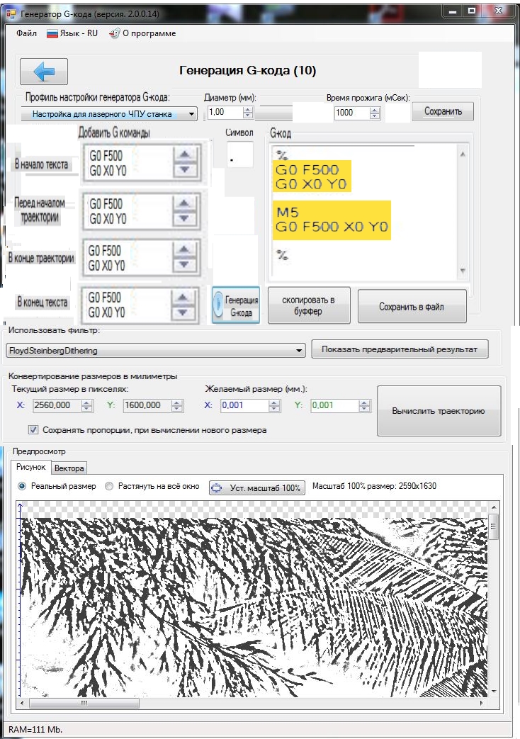 Нижняя часть окна - работа с изображением, верхняя - работа с генератором G кода. С нижней примерно все ясно, может только добавить кнопку "окно предпросмотра" во весь экран, как рисунка так и вектора.