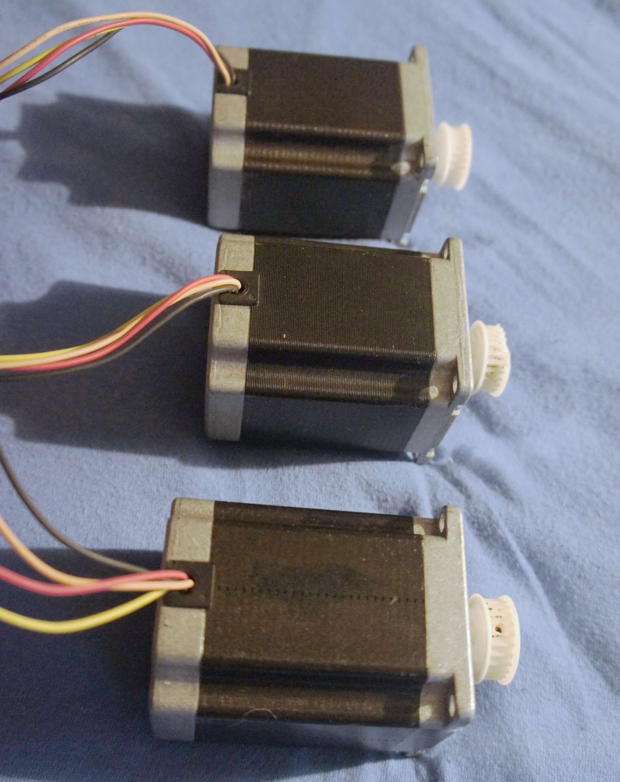 Забрал посылку с движками. Выглядят вполне нормальными, корпусы немного пошарпаны, фланцы посадочные не коцанные. Валы спрятаны под шестернями, шестерни на штифтах в виде разрезных втулок. На концах проводов 3миллиметровые 4контактные папа-разъемы с мама-контактами ATX/EPS, как на блоках питания ATX для доппитания проца