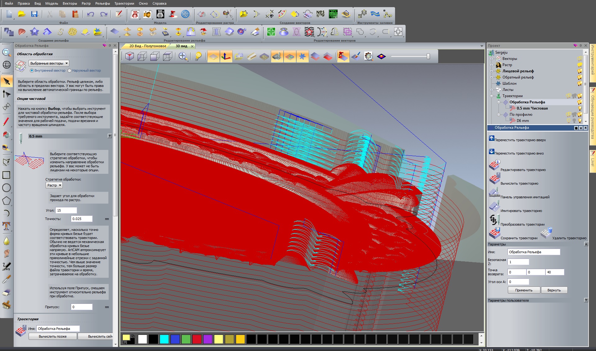 3д обработка рельефа с наклонным врезанием (3 градуса 15 мм) по растру (15 градусов). Начинается выше самой заготовки врезание.