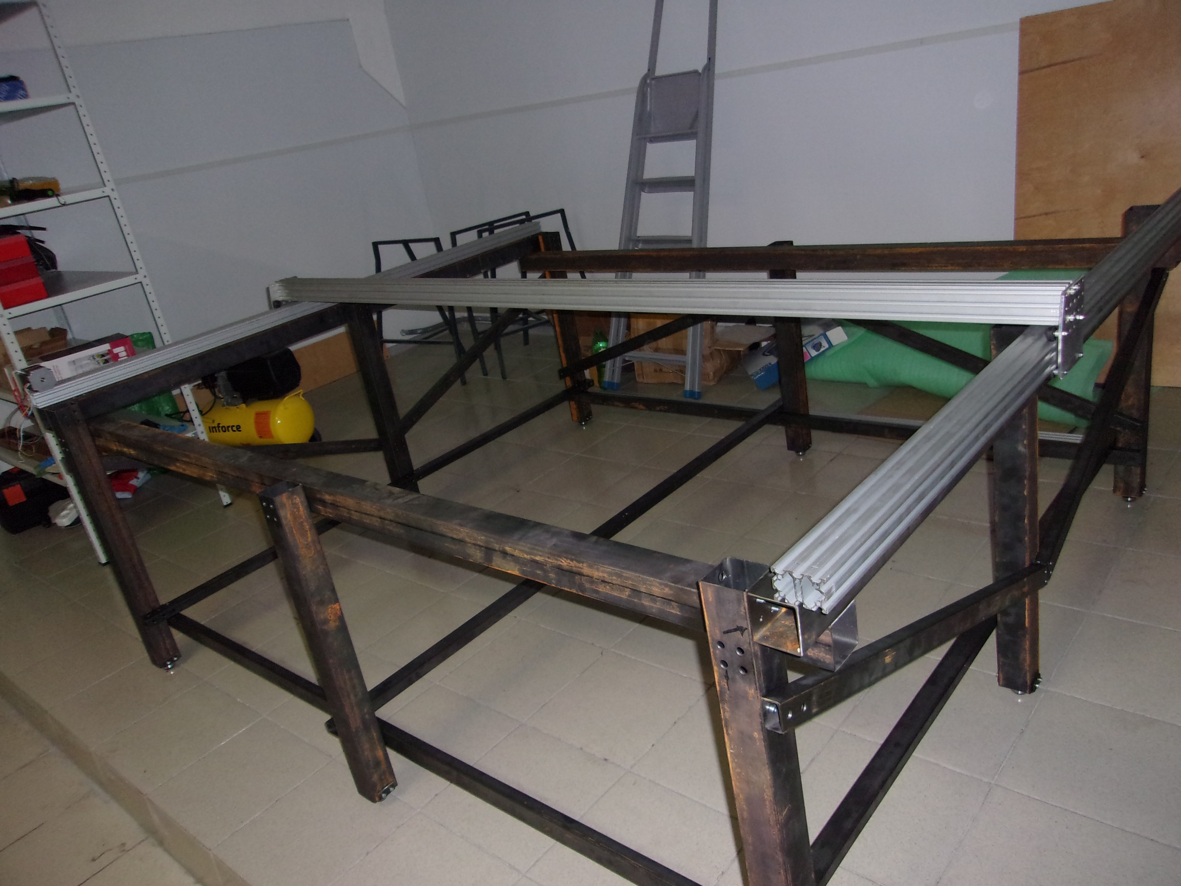 ЗЫ собственно мой пример) раскопал фото с процесса постройки, рама выглядит вот так - я сначала прикинул, во сколько мне для такой конструкции обойдется станочный профиль и ведро Т-гаек, вздохнул, пошел пилить и сверлить)
