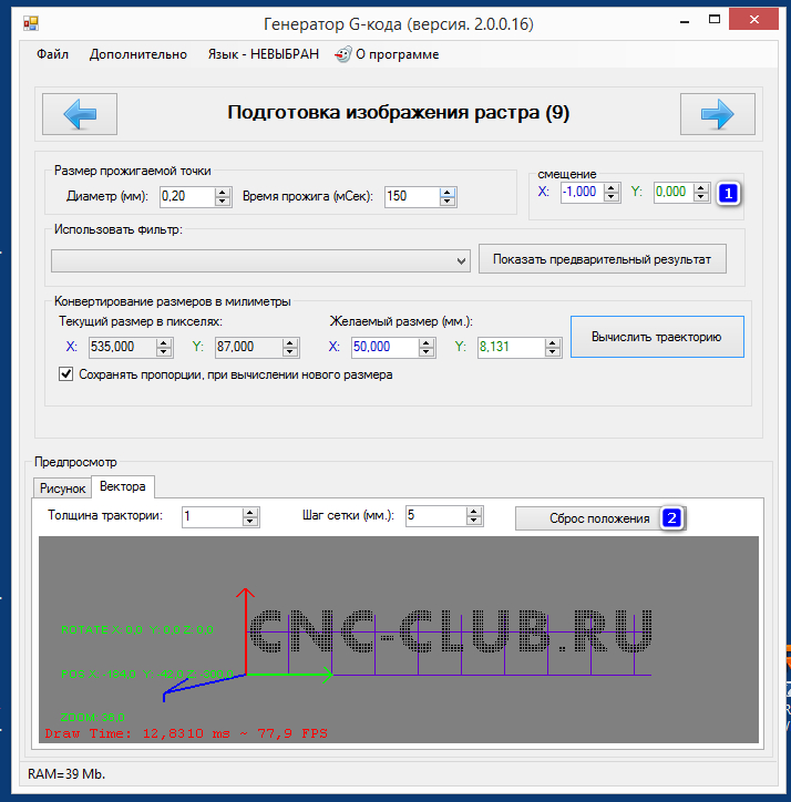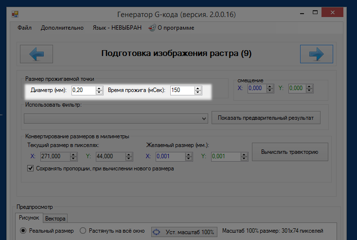 Еще одно замечание: если начать работать с изображением "в точках", дойти до генерации кода, а потом вернуться стрелками назад и выбрать обработку "контур", то изображение на предпросмотре останется точками. Лечится перезапуском программы.