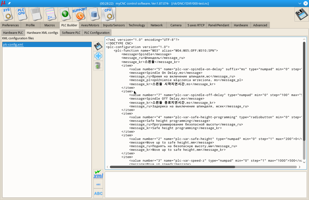 Написание PLC процедур, компиляция и просылка в контроллер осуществляется из самой оболочки myCNC (закладки называются PLC Builder). Скрины PLC Builder и редактора макросов приведены ниже. Для макросов также есть набор визардов для создания макросов для хоуминга, центроискателя, измерения длины инструмента, автосмены и тд. Визарды можно использовать как для получения реальных макросов, так и с целью изучения системы или получения "рыбы" для дальнейшего ручного редактирования.