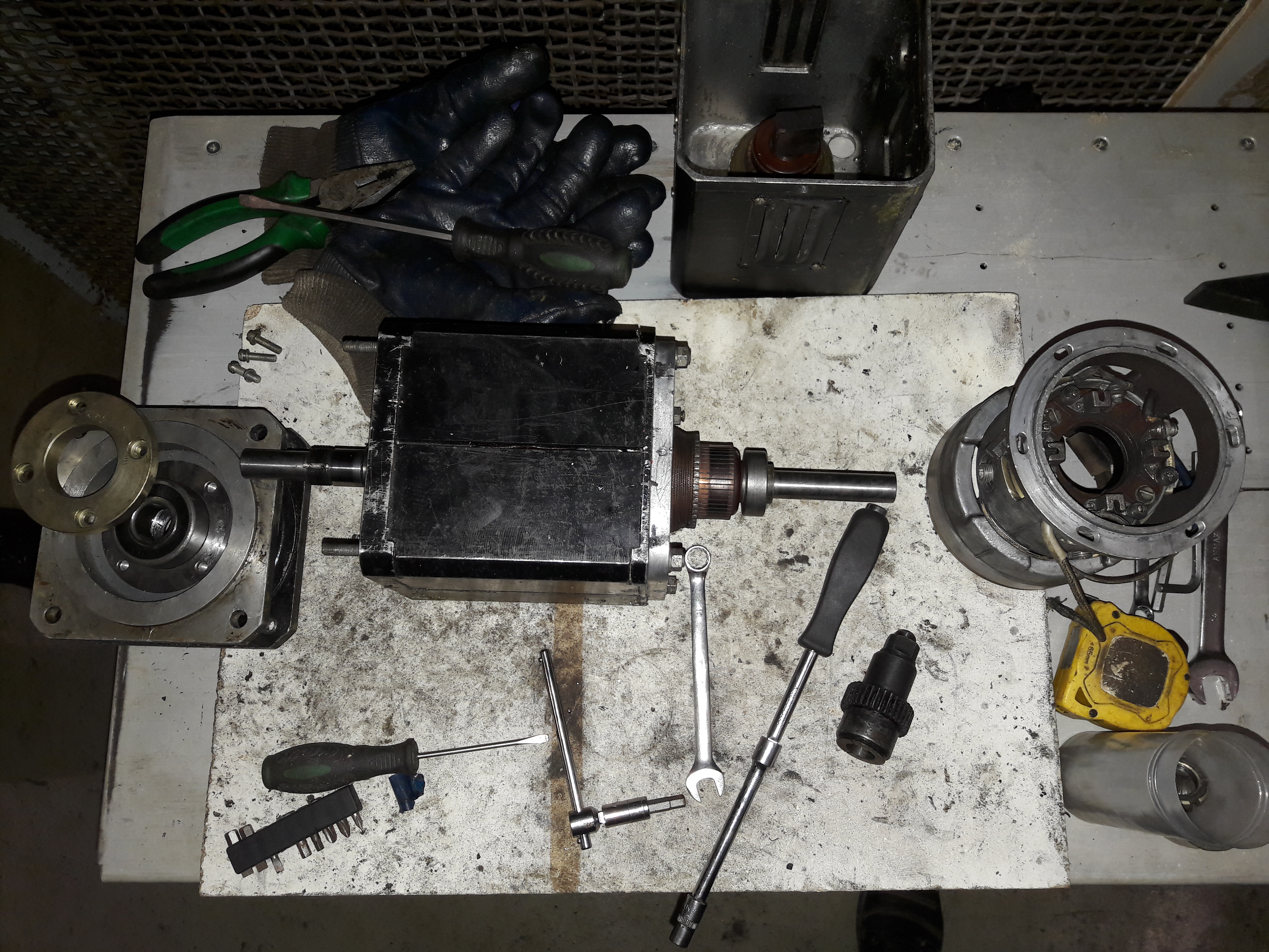 Подшипники можно снять без ивлечения статора. Сначала извлекаем все щетки. Потом извлекаем тахогенератор. Ставим метку - как установлен щеткодержатель. В немже держится задний подшипник. Потом снимаем шеткодержатель. Идем в переднию часть. Откручиваем стопорную гайку. Откручиваем кольцо которое держит подщипник. Откручиваем переднию крышку, где стоит подшипгик. Снимаем подшипник вместе с крышкой. При этом ротор остовляем в статоре. Можно сьемником упереться в вал и тянуть крышку на себя. Мне съемник не понадобился. Не забываем смотреть состояние шеток.