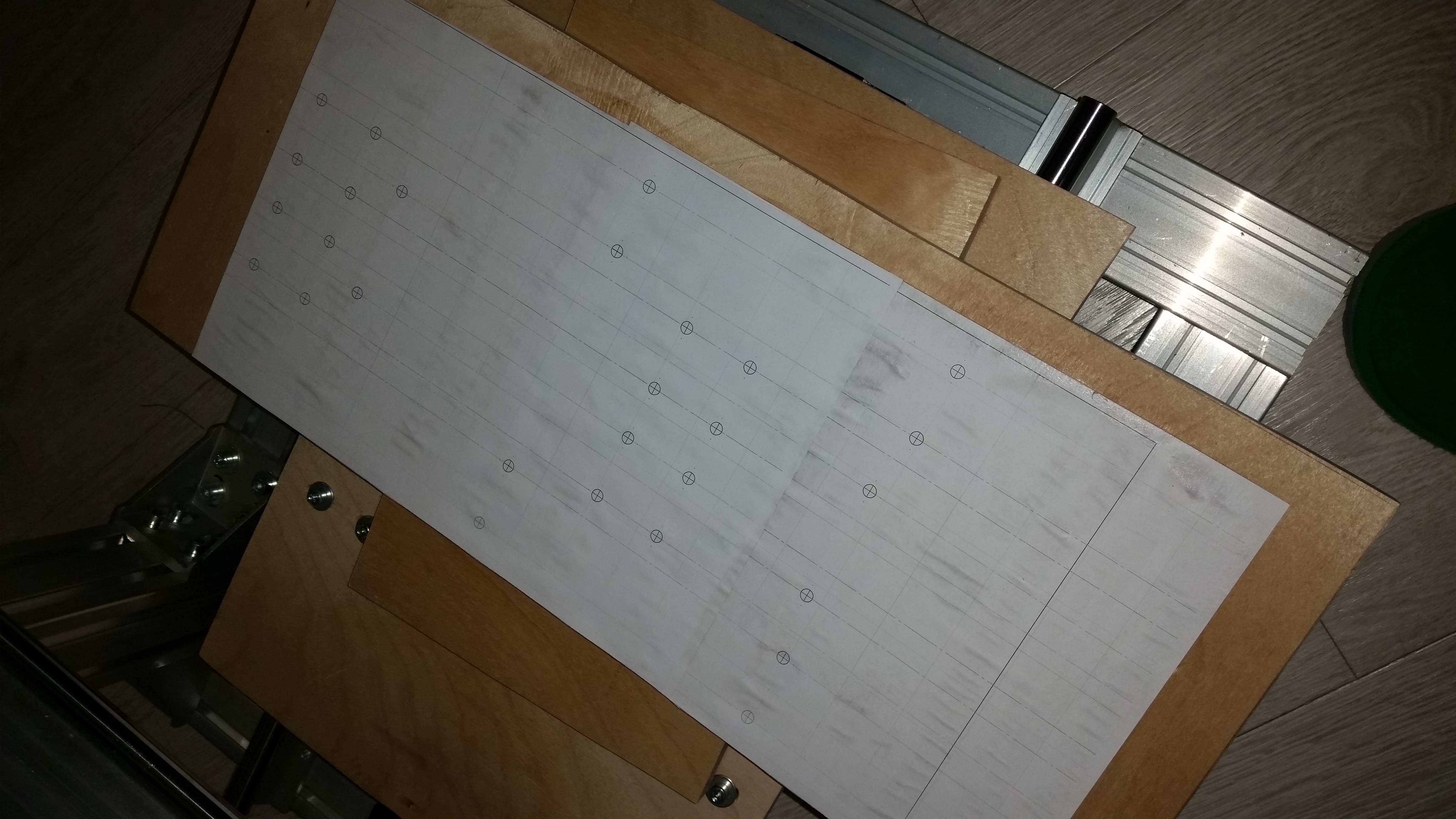 На фото разметка под панель оси Z. На один лист А4 не влезло, поэтому распечатал 2 раза, совместил центровочные отверстия на просвет лампы и склеил листы между собой.