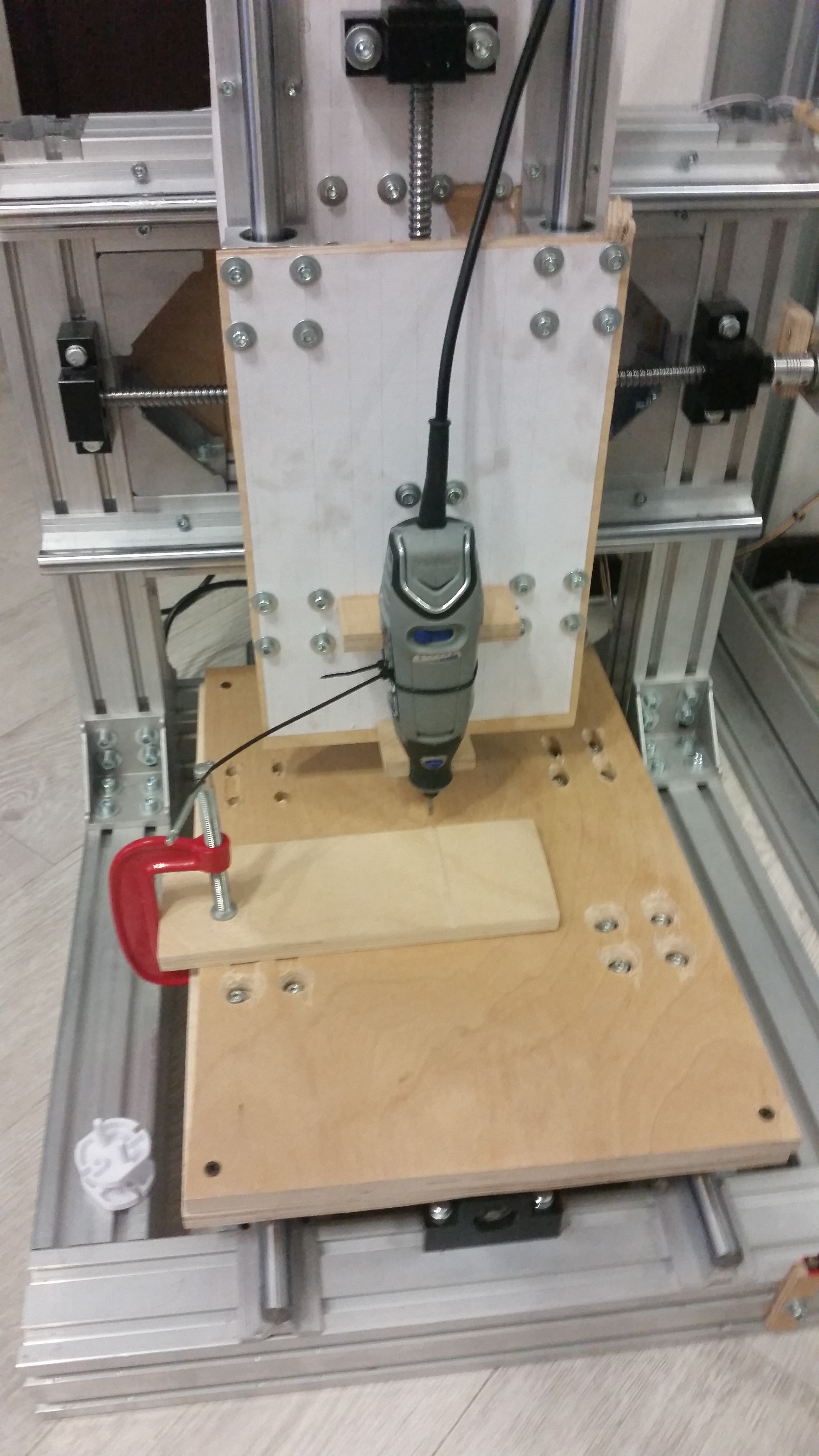 Сделал рабочий стол, закрепил дремель на стяжку и давай пилить - для начала потренировался на фанере в позиционировании и прочем, затем сделал углубления для шурупов на столе.