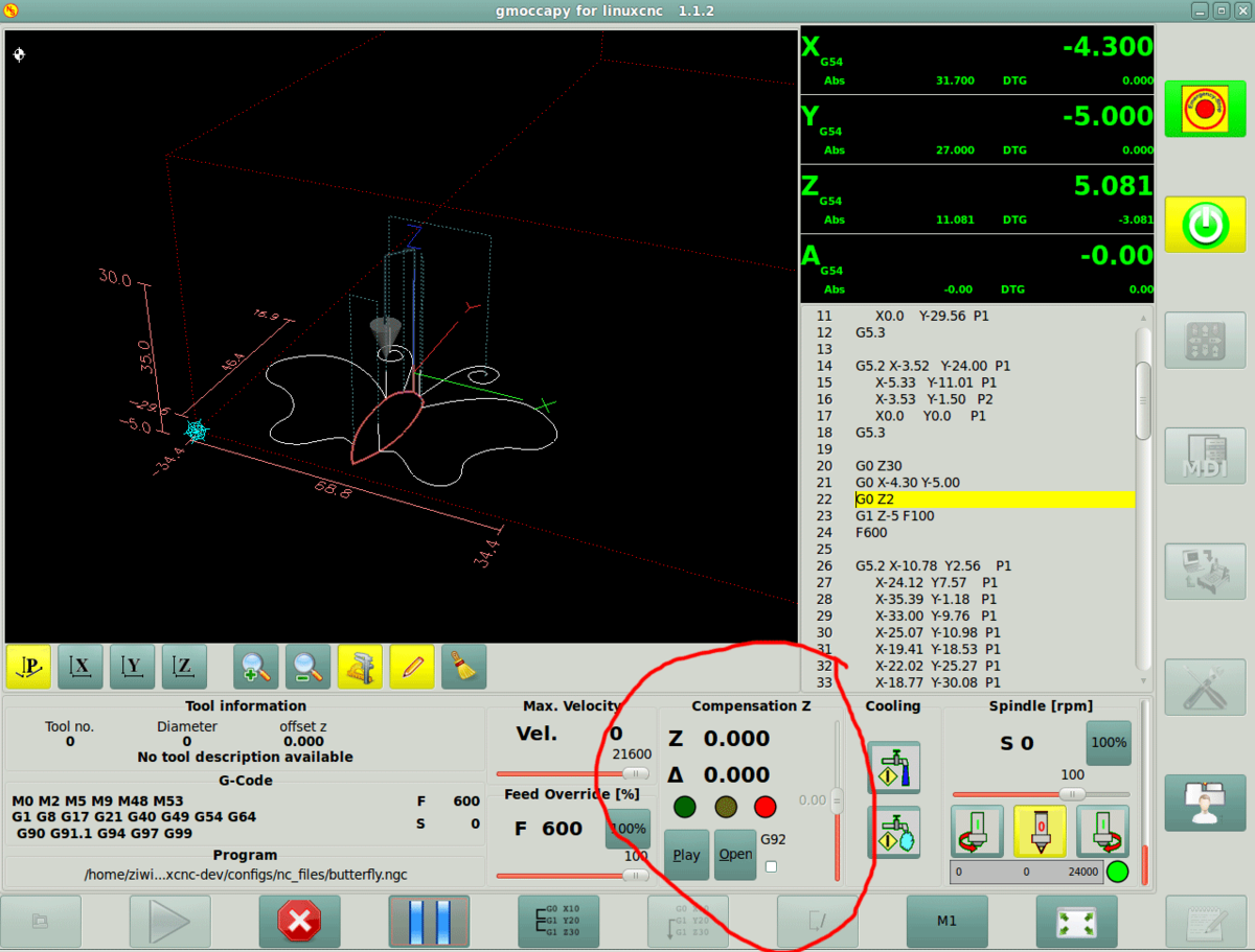 verser писал(а):Есть готовое решение под интерфейс gmoccapy, называется CompensationZ, можно слайдером двигать смещение по Z в процессе резки.
