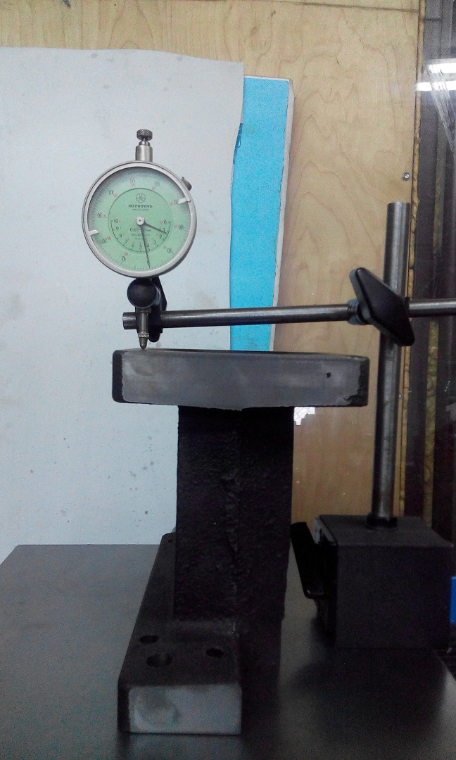 Снимаем крепление двигателя с поперечки, ставим на плиту и измеряем переллельность плоскости под движок и привалочной плоскости к станине. Перепад 3.5 десятки.