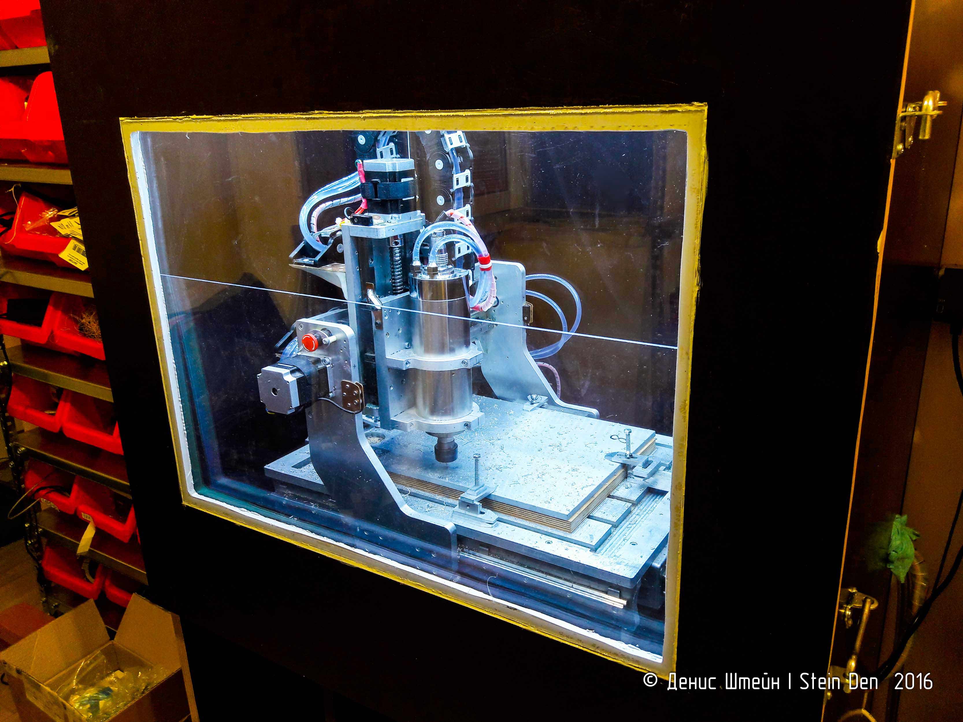 Защитный экран не дает разлетаться стружке, даже тогда, когда станок работает с открытой дверцей. После работы я просто прохожу пылесосом с аквафильтром под стеклом и затем внутри шкафа, убрав стекло. Теперь носки чистые от алюминиевой стружки и пыли :hehehe: