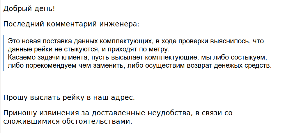 Купил для Тадам-2 у Пурелоджика их новинку - комюинированную рейку, https://purelogic.ru/catalog/peredachi/ ... irovannye/. Железки по приходу понравились, но купил, видимо, напрасно - чертеж навран, утверждения "рейки стыкуются" (в смысле для рельса длинее 1м) оказалось враньем - после непродолжительной полемики сами это признали. Суть в том, что нарезав отверстия под крепеж рейки не согласовали их смещение по сравнению с зубьями. Ответ сперва прислали такой (скрины по порядку, имена на русском = не вставились в сообщение).