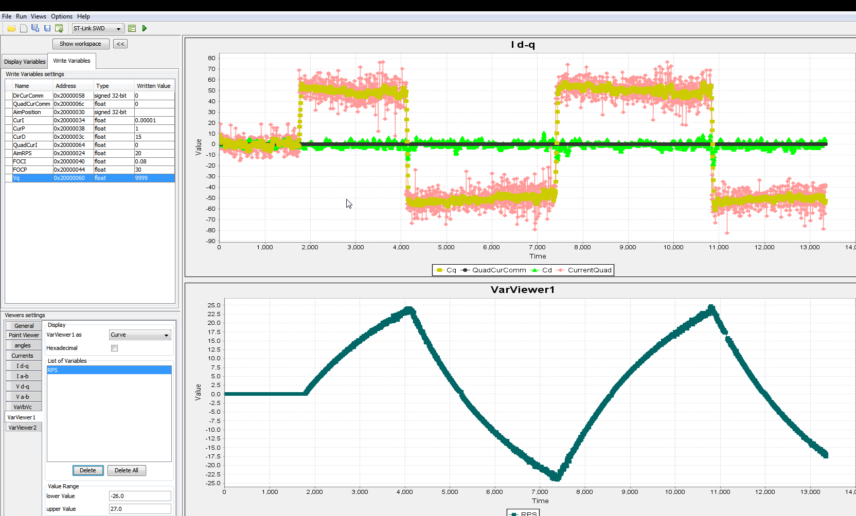 Озадачился эмулятором работы Кортекса М4 с целью визуально наблюдать работу умножителя. Искал, искал, и набрёл на официальном сайте на STM-STUDIO-STM32. Ничего общего с симуляцией нет, зато визуально показывает значения указанных переменных/регистров во время реальной работы МК. Считывает данные с помощью ST-LINK (JTAG или SWD). Адреса переменных вбиваем вручную или импортируем из бинарника, указываем лимиты и наблюдаем изменение с течением времени. К примеру, в код можно добавить отладочные переменные с текущими входными и выходными значения STEP/DIR для каждой оси. И затем наглядно изучать косяки умножителя.