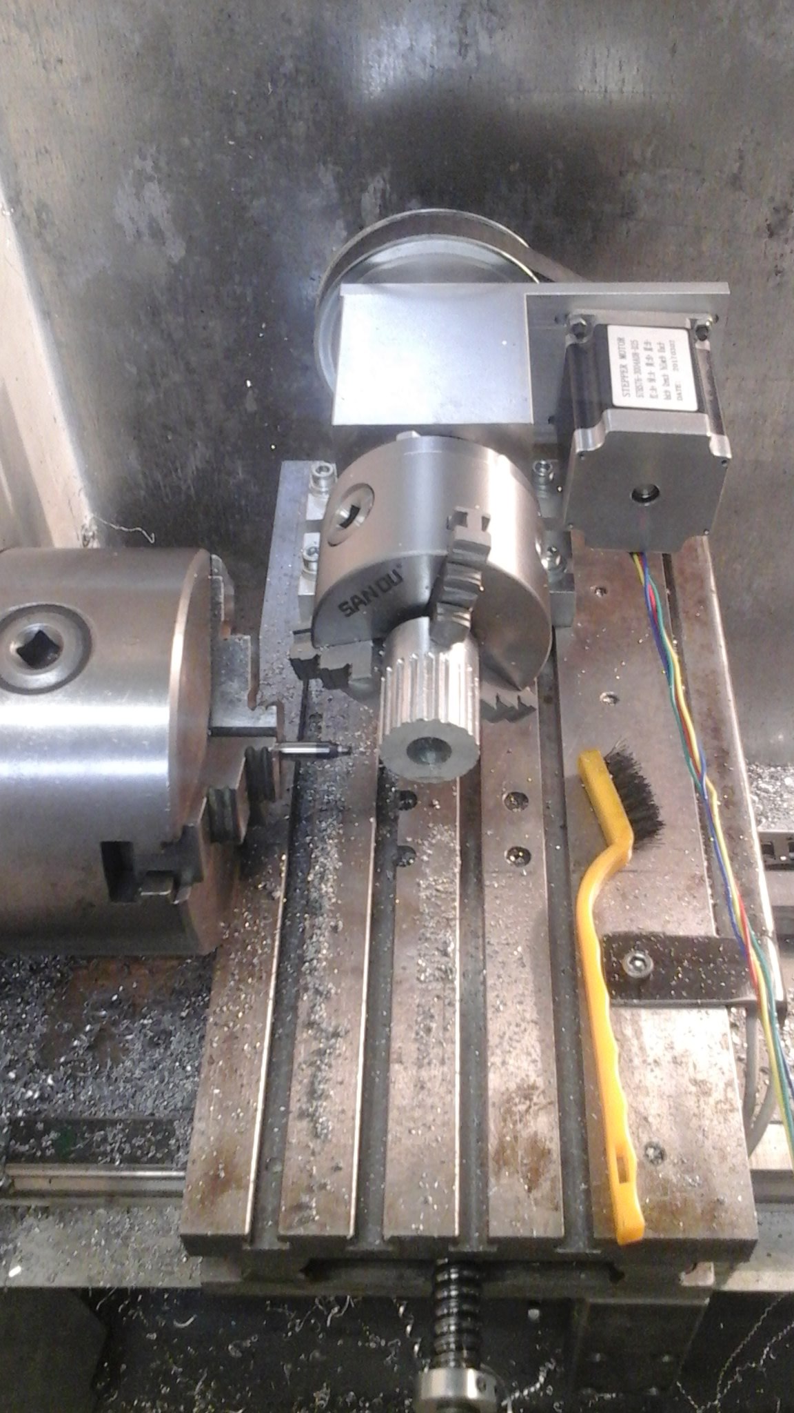 Сегодня поставил поворотную ось, выточил заготовку, выставил. Начал фрезеровать твердосплавной радиусной фрезой ф3мм, которую довольно быстро сломал, она уже очень уставшая была. Заточил хвостовик сверла ф3мм, зажал, потихонечку прорезал. Ремень облегает нормально, но чтобы легко ложился в канавки, придется сгладить их кромки радиусной фрезой миллиметров 6 в диаметре примерно.