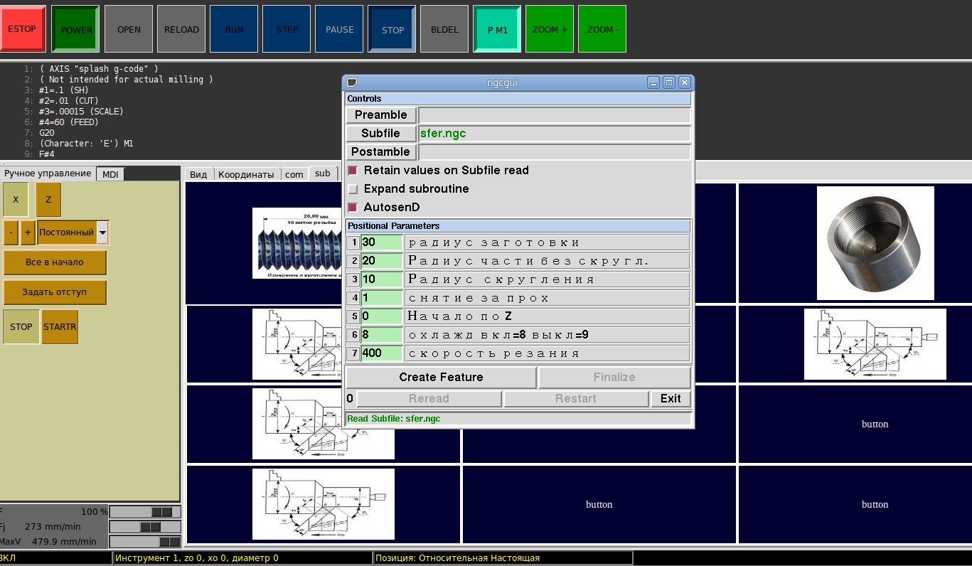 Этим мы передали наши параметры в создаваемый ngcgui файл auto.ngc. Изменим некоторые параметры(например координаты начала обработки) Нажмем еще раз "CreateFeature".В файл auto.ngc передались также и новые параметры.Нажимаем "Finalize"-загружаем готовый файл с двумя подпрограммами: Чтобы объеденить подпрограммы с разных вкладок :