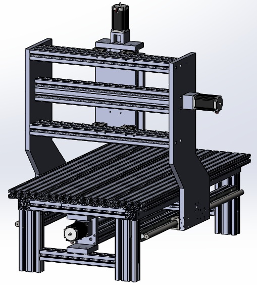 Станок сделан из алюминиевого профиля и дюралевой плиты 20мм. Размеры профиля 40х40 (одна деталь), 45х45, 45х90, 30х150. Двигатели в реальности немного другие, но самому рисовать не хотелось, поэтому взял где-то готовые. Движение осей производится за счёт ШВП 1605, по круглым направляющим с опорой SBR20 по осям X и Y и SBR16 по оси Z.