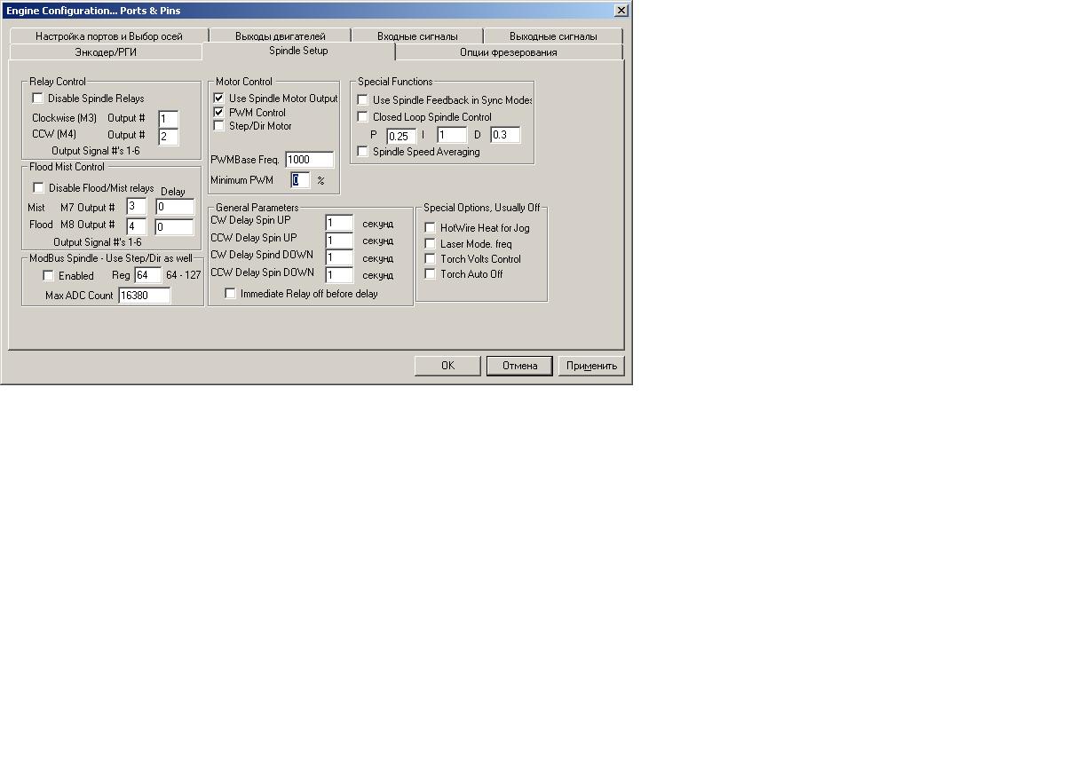 По первому вопросу мои первоначальные настройки и подключение PWM: http://www.cnc-club.ru/forum/viewtopic. ... 3&start=40, #49-50